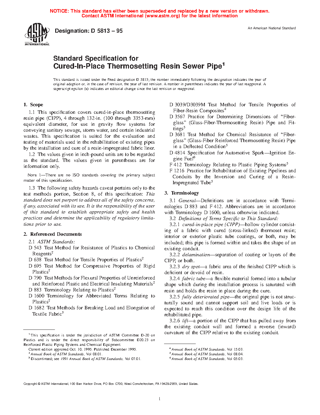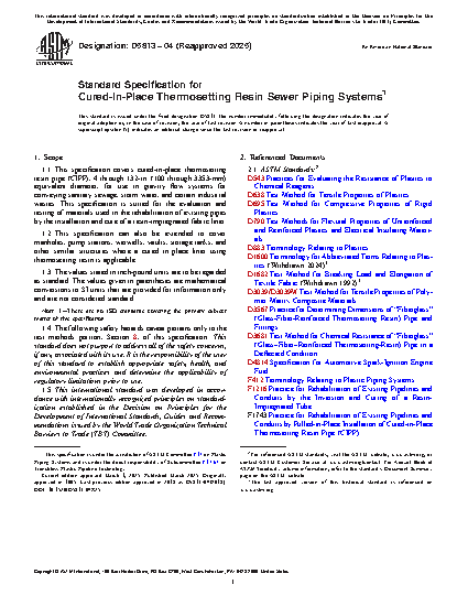 1.1 This specification covers cured-in-place thermosetting resin pipe (CIPP), 4 through 132-in. (100 through 3353-mm) equivalent diameter, for use in gravity flow systems for conveying sanitary sewage, storm water, and certain industrial wastes. This specification is suited for the evaluation and testing of materials used in the rehabilitation of existing pipes by the installation and cure of a resin-impregnated fabric liner.