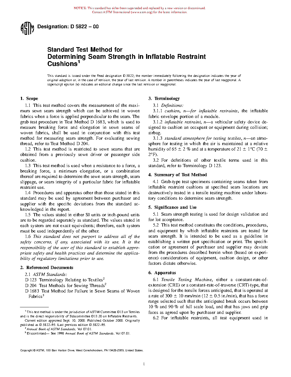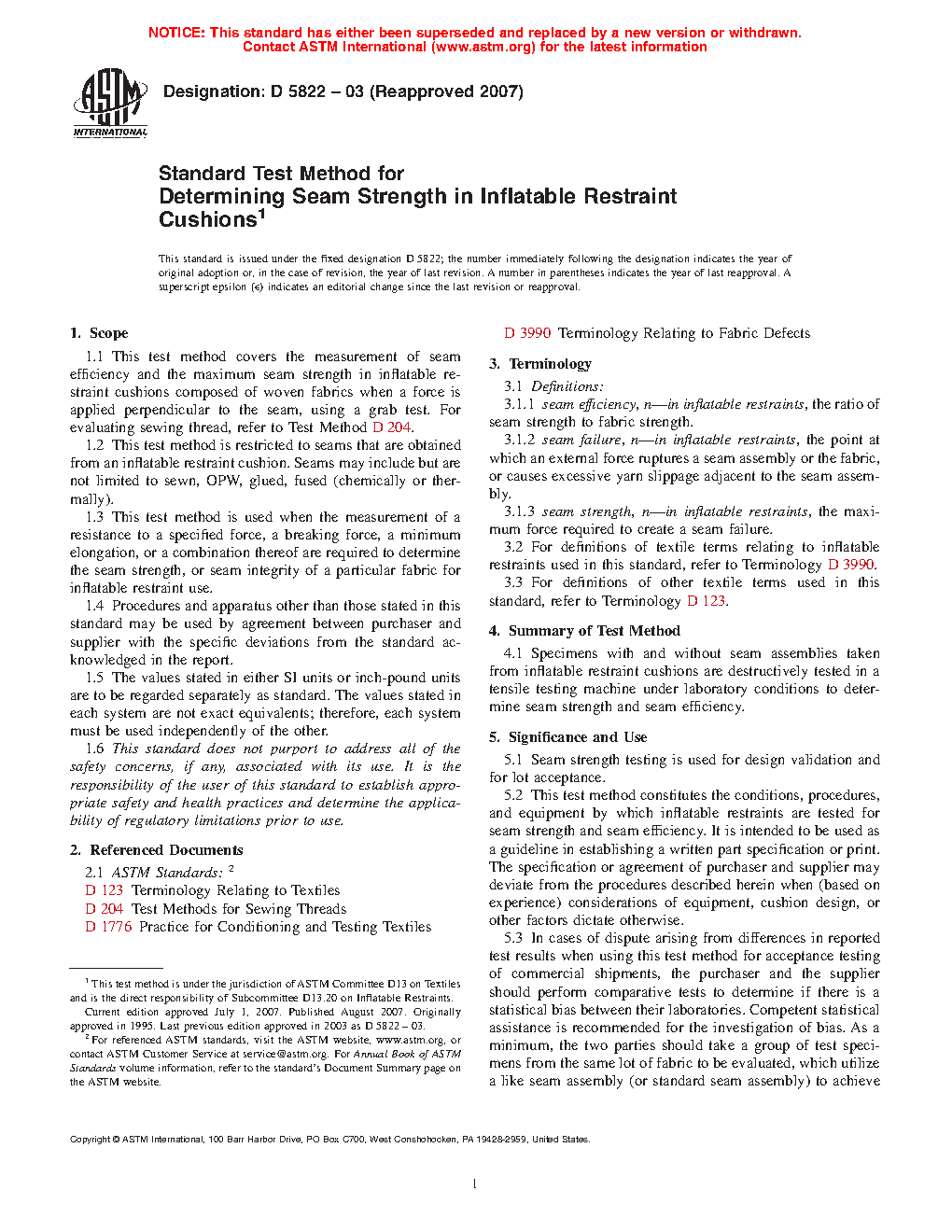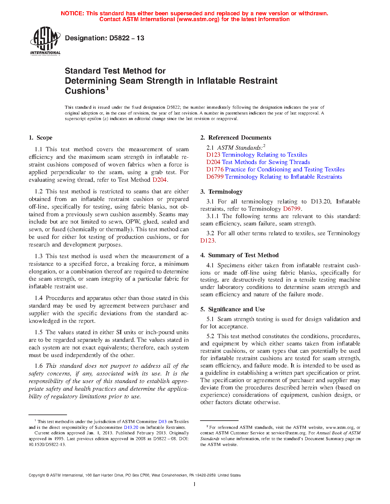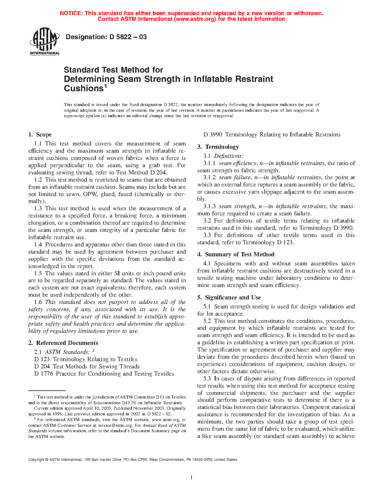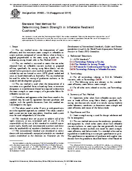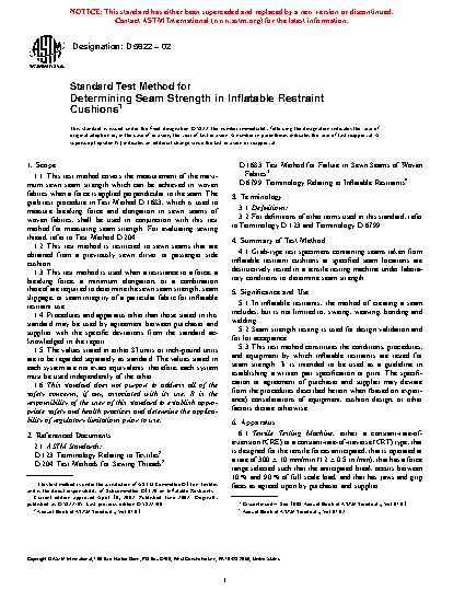 1.2 This test method is restricted to seams that are either obtained from an inflatable restraint cushion or prepared off-line, specifically for testing, using fabric blanks, not obtained from a previously sewn cushion assembly. Seams may include but are not limited to sewn, OPW, glued, sealed and sewn, or fused (chemically or thermally). This test method can be used for either lot testing of production cushions, or for research and development purposes.