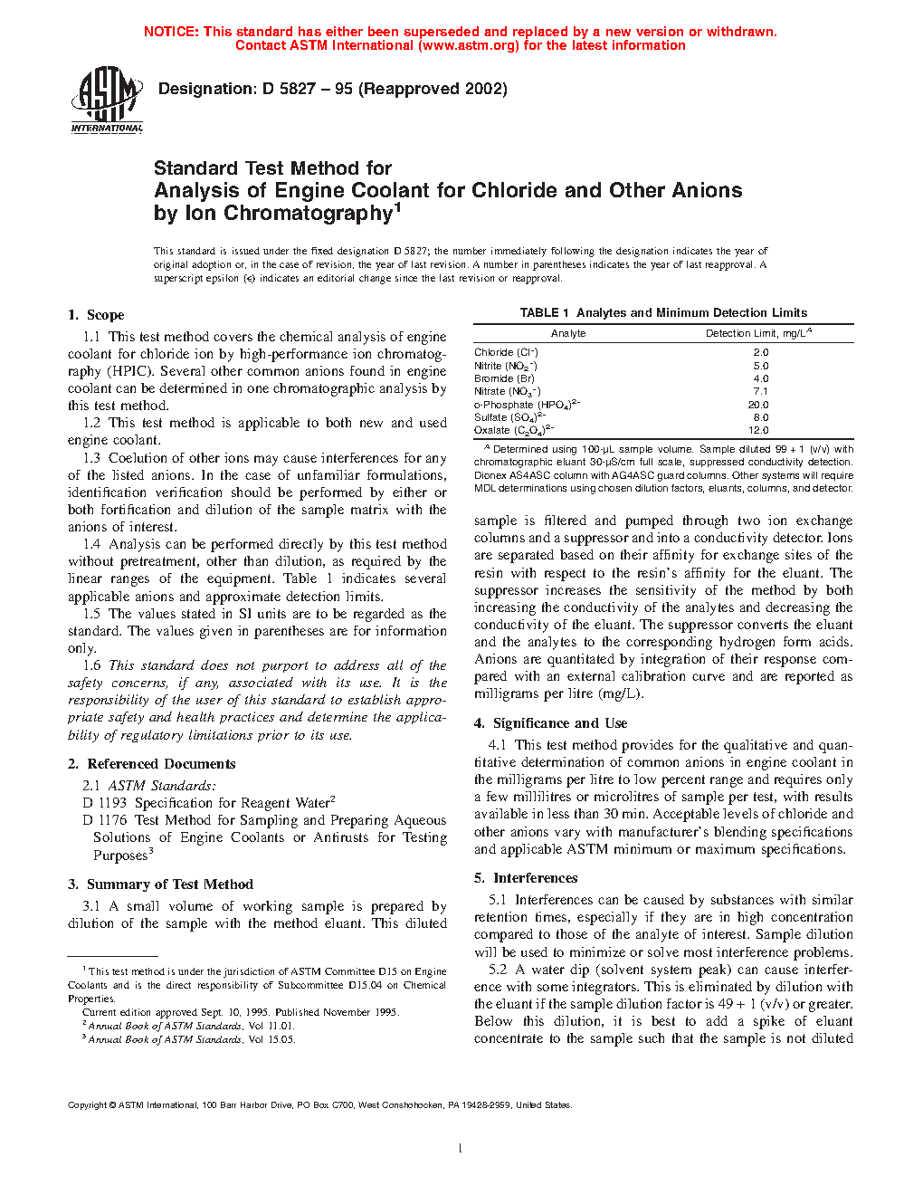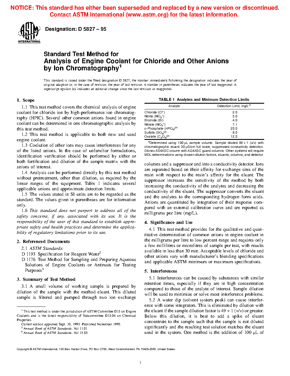 1.4 Analysis can be performed directly by this test method without pretreatment, other than dilution, as required by the linear ranges of the equipment. Table 1 indicates several applicable anions and approximate detection limits.