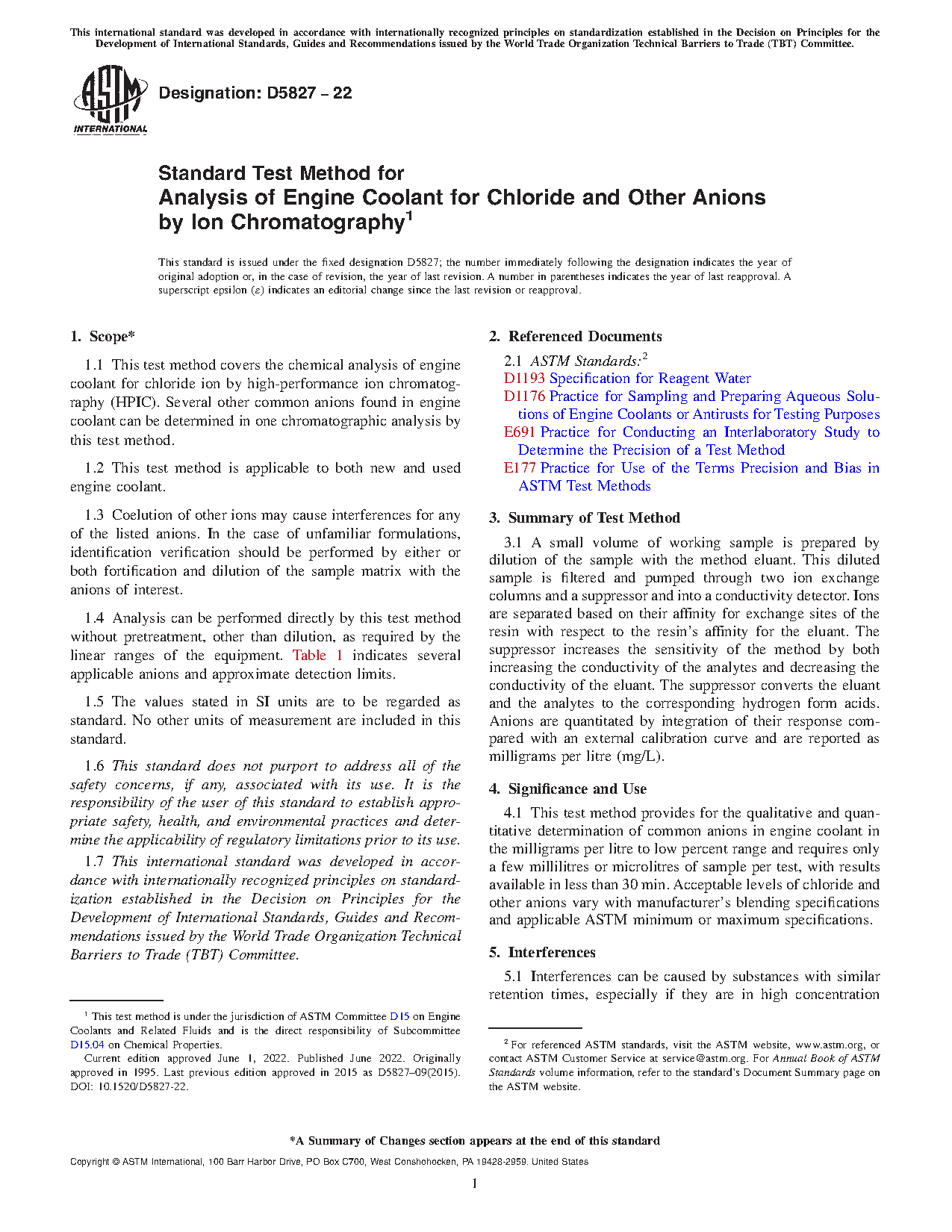 1.1 This test method covers the chemical analysis of engine coolant for chloride ion by high-performance ion chromatography (HPIC). Several other common anions found in engine coolant can be determined in one chromatographic analysis by this test method.