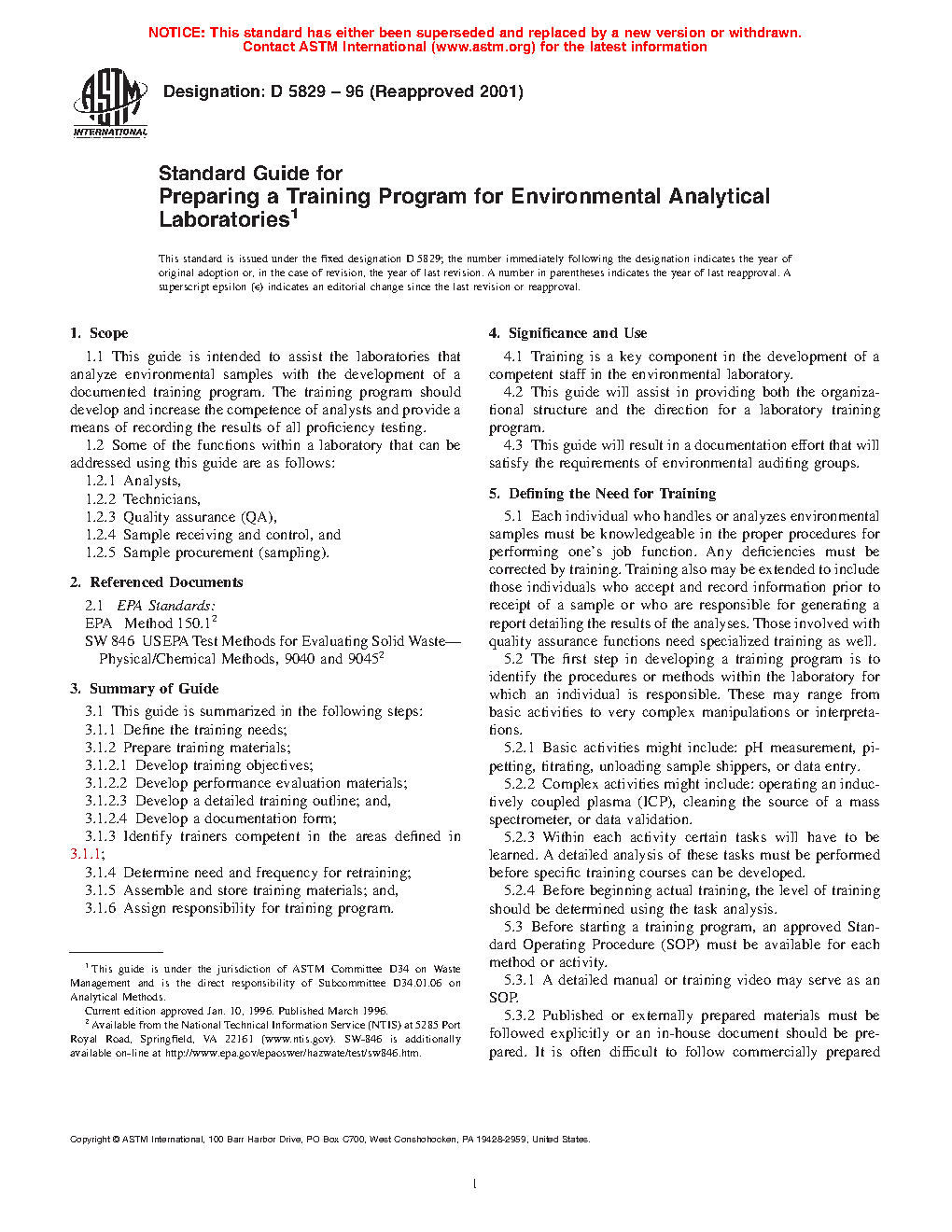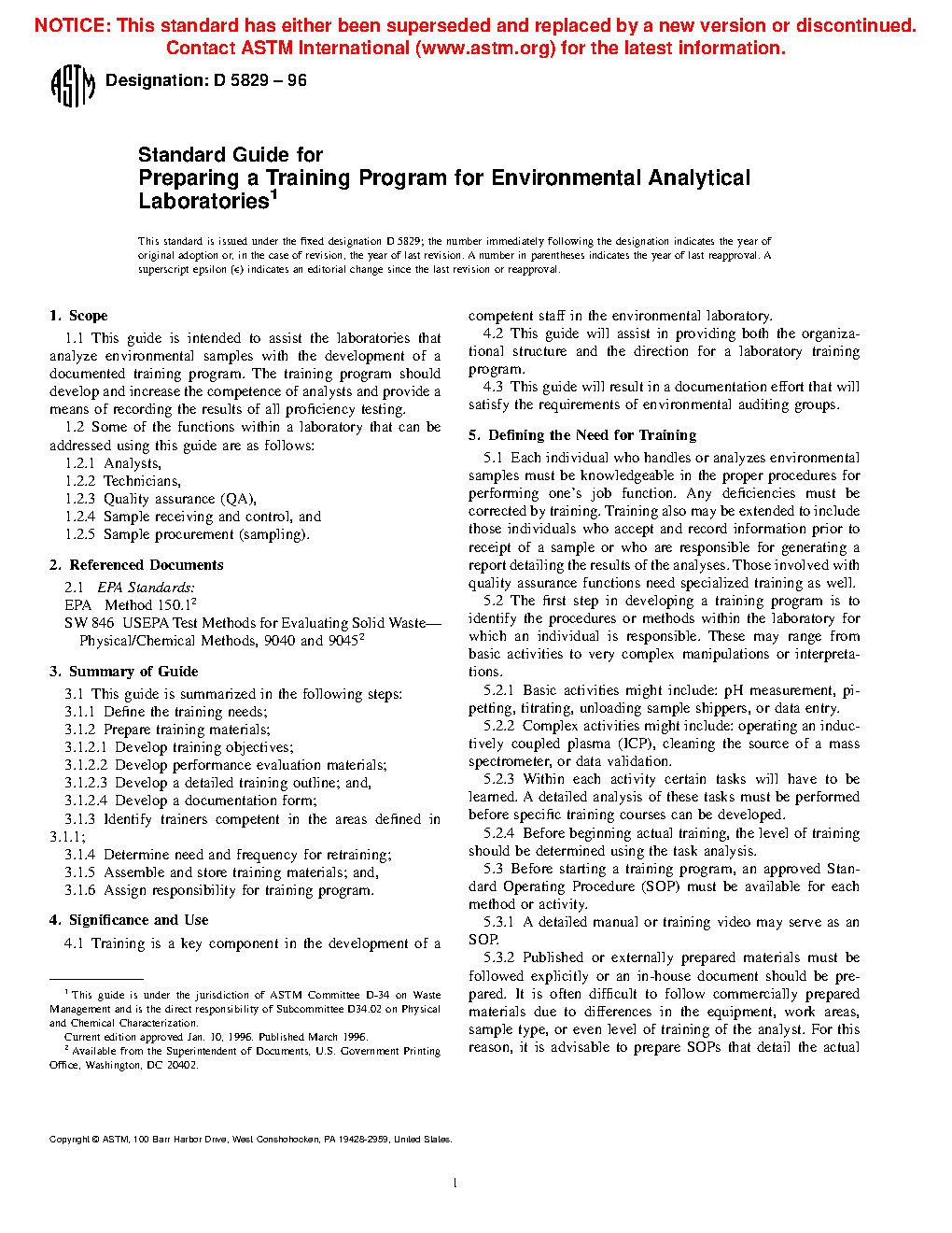 1.1 This guide is intended to assist the laboratories that analyze environmental samples with the development of a documented training program. The training program should develop and increase the competence of analysts and provide a means of recording the results of all proficiency testing.