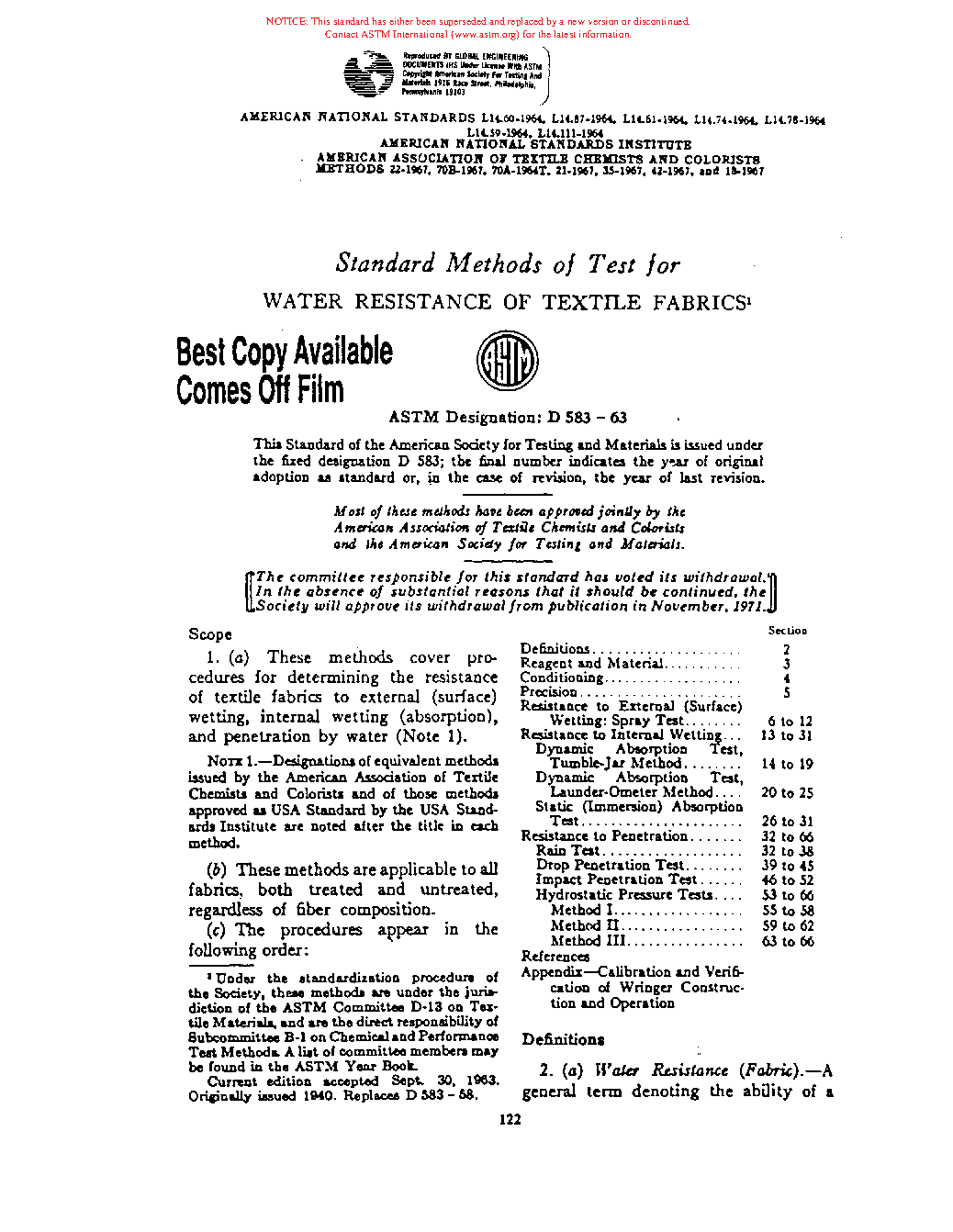 Methods of Test for Water Resistance of Textile Fabrics (Withdrawn 1971)