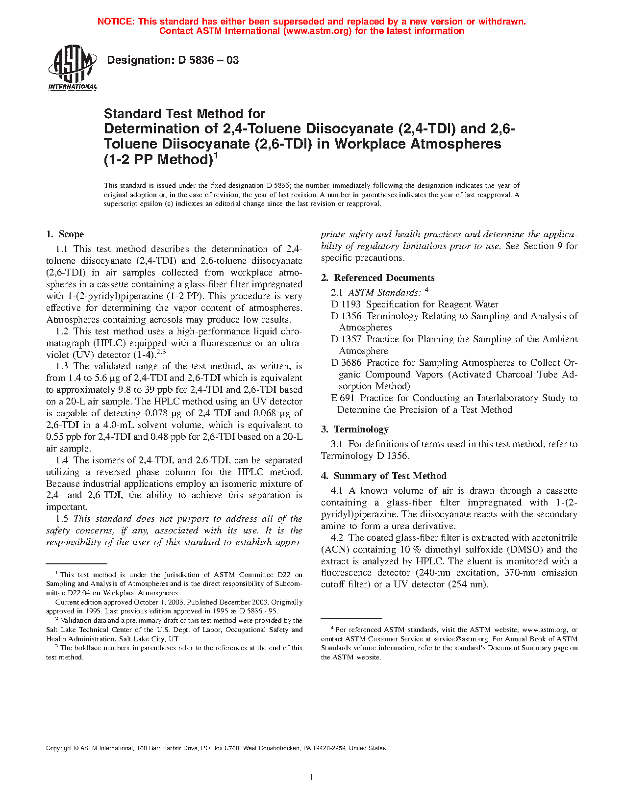1.1 This test method describes the determination of 2,4-toluene diisocyanate (2,4-TDI) and 2,6-toluene diisocyanate (2,6-TDI) in air samples collected from workplace atmospheres in a cassette containing a glass-fiber filter impregnated with 1-(2-pyridyl)piperazine (1-2 PP). This procedure is effective for determining the vapor content of atmospheres. It is advisable to perform a field extraction for atmospheres containing aerosols to avoid the possibility of an underestimation.