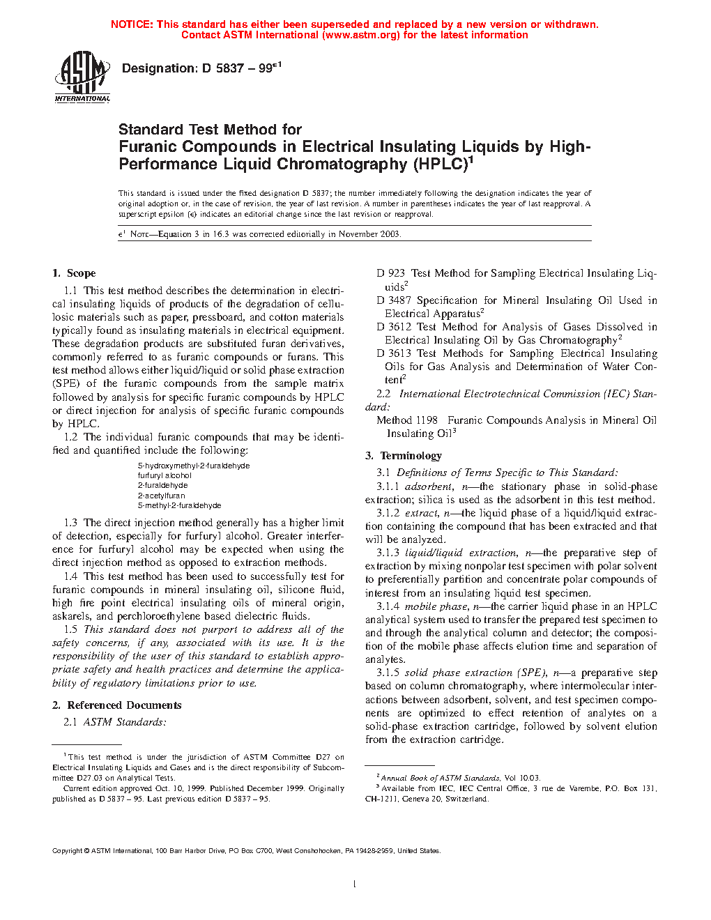 1.1 This test method describes the determination in electrical insulating liquids of products of the degradation of cellulosic materials such as paper, pressboard, and cotton materials typically found as insulating materials in electrical equipment. These degradation products are substituted furan derivatives, commonly referred to as furanic compounds or furans. This test method allows either liquid/liquid or solid phase extraction (SPE) of the furanic compounds from the sample matrix followed by analysis for specific furanic compounds by HPLC or direct injection for analysis of specific furanic compounds by HPLC.
