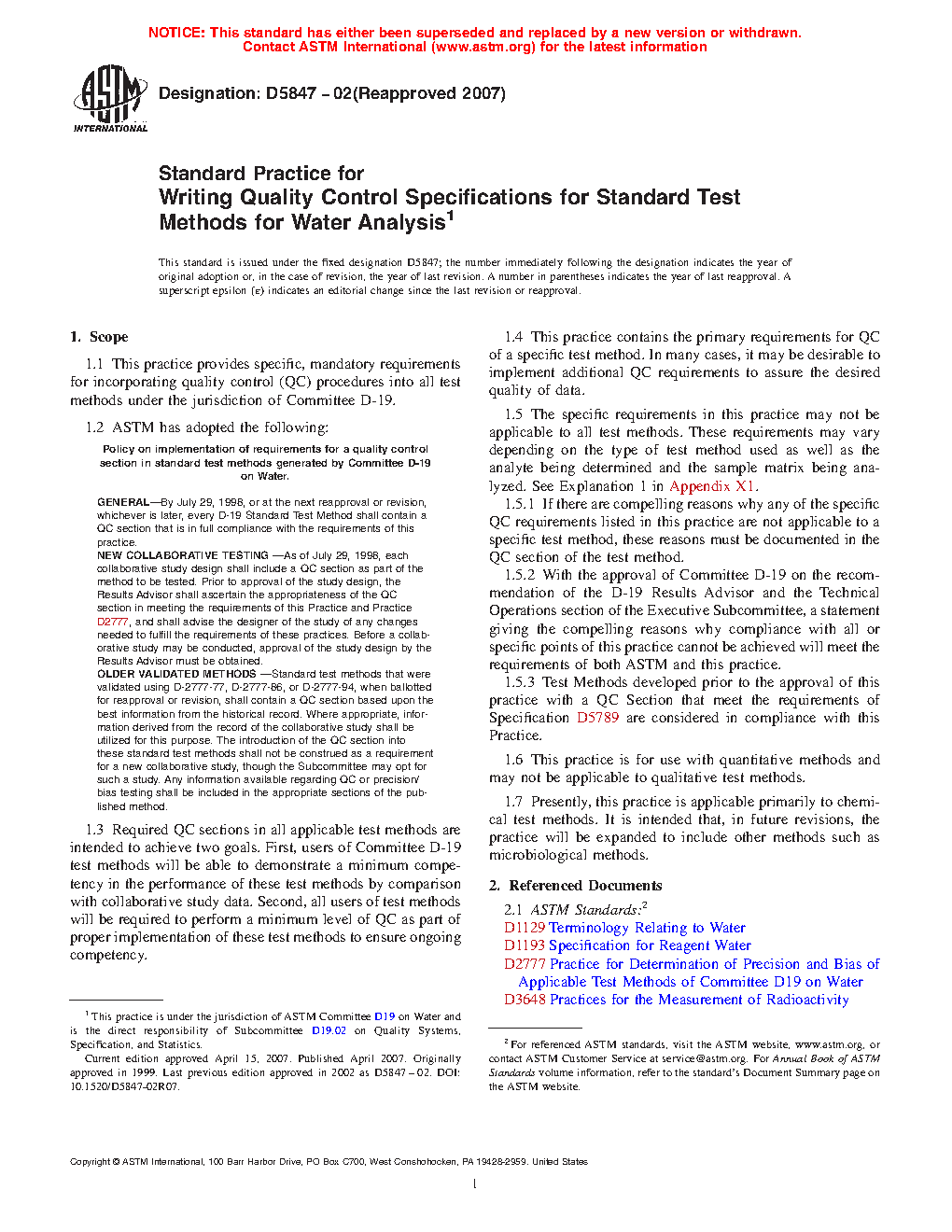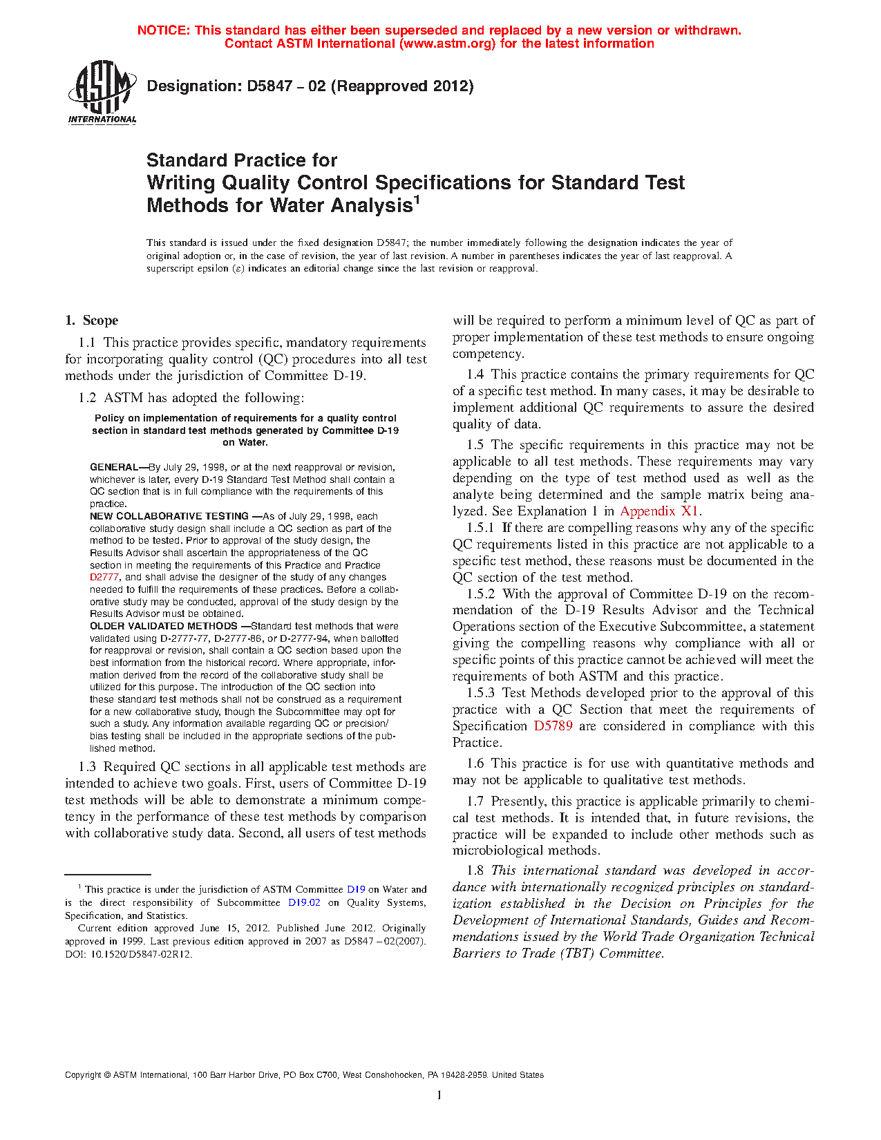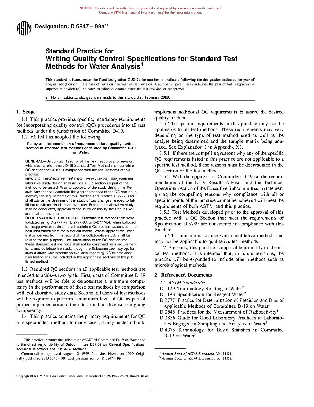 | Policy on implementation of requirements for a quality control section in standard test methods generated by Committee D-19 on Water. | ||