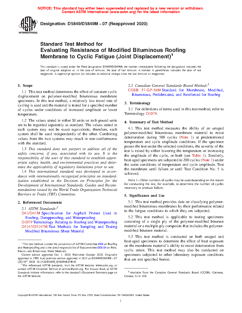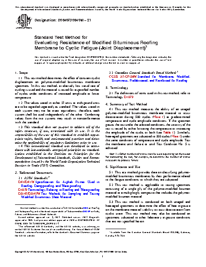 1.1 This test method determines the effect of constant cyclic displacement on polymer-modified bituminous membrane specimens. In this test method, a relatively low travel rate of cycling is used and the material is tested for a specified number of cycles under conditions of increased amplitude or lower temperature.
