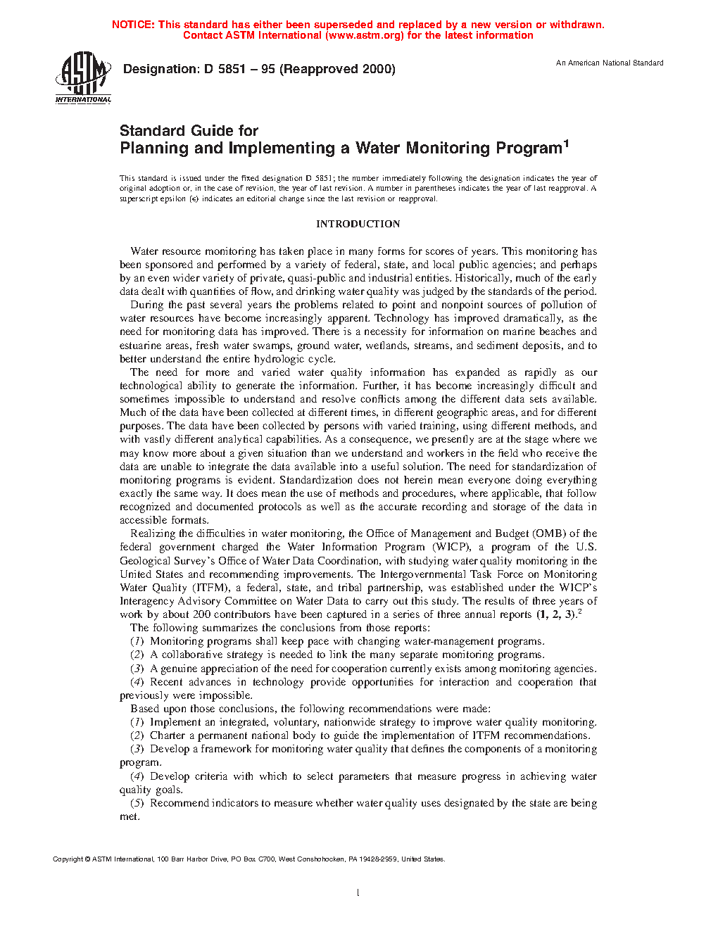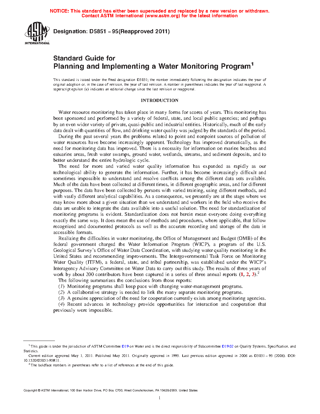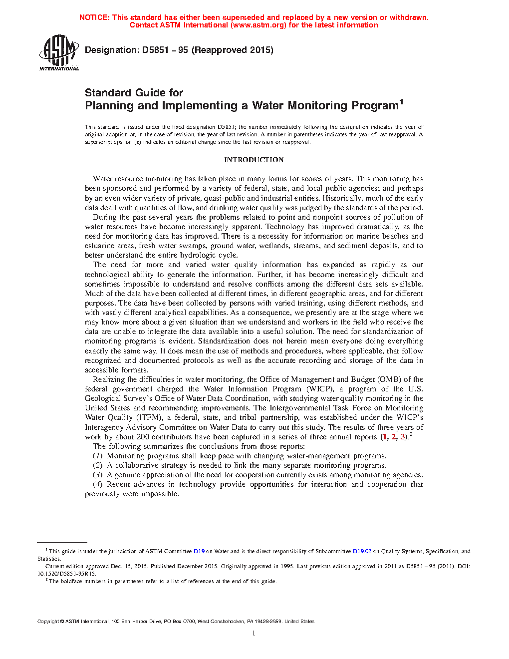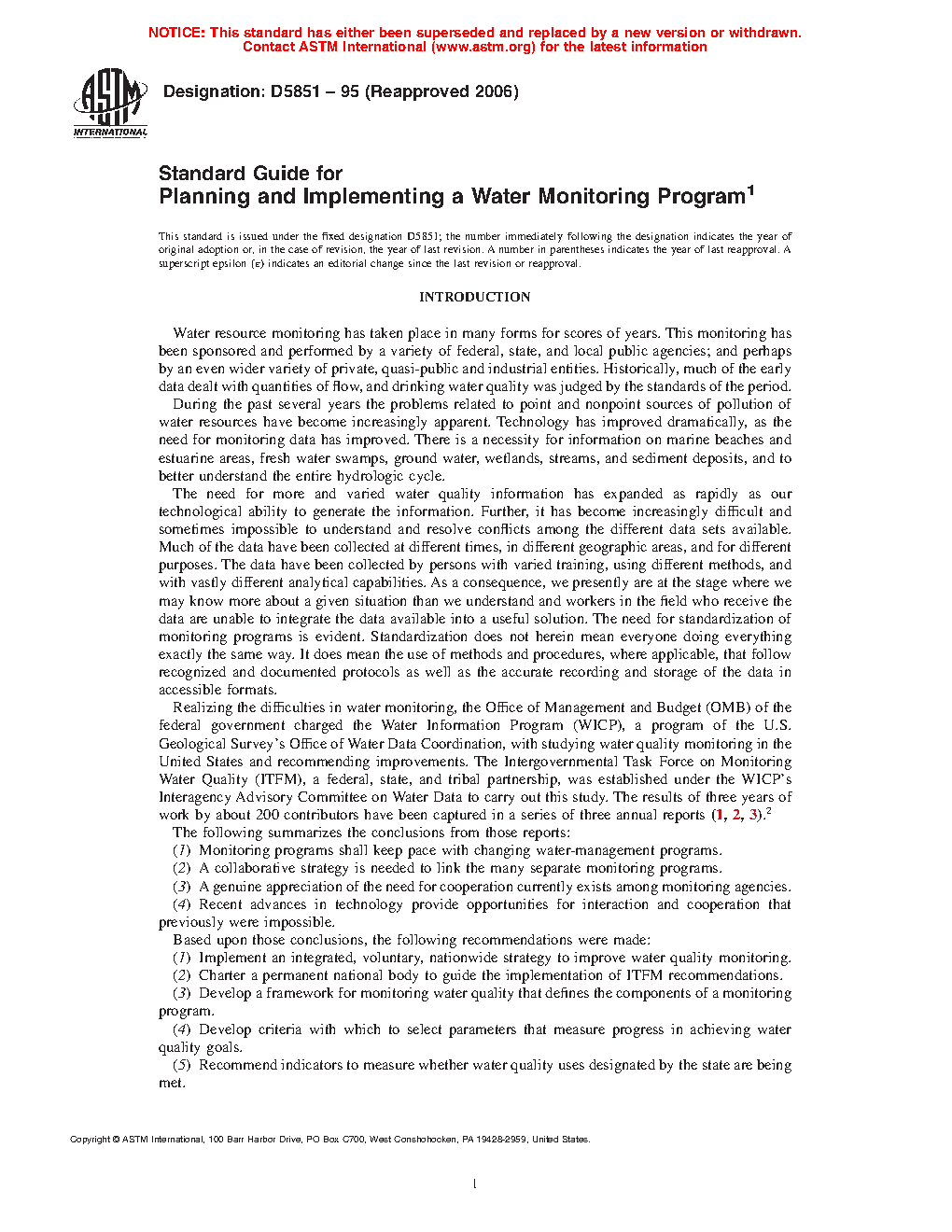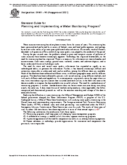 1.3 This guide is intended to outline for planners and administrators the components, process, and procedures which should be considered when proposing, planning, or implementing a monitoring program. The guide is not a substitute for obtaining specific technical advice. The reader is not assumed to be a technical practitioner in the water field; however, practitioners will find it a good summary of practice and a handy checklist. Other standard guides have or will be prepared that address the necessary detail.