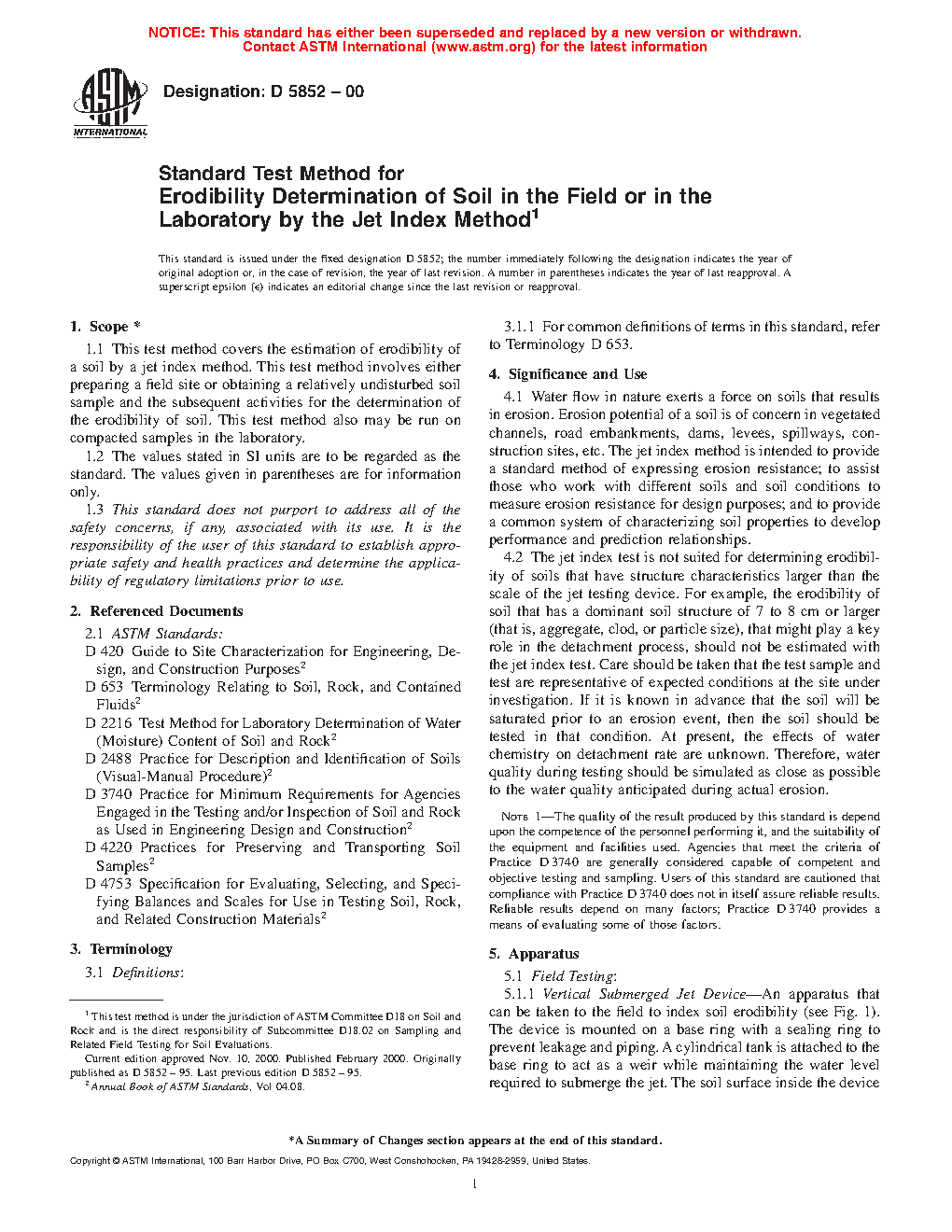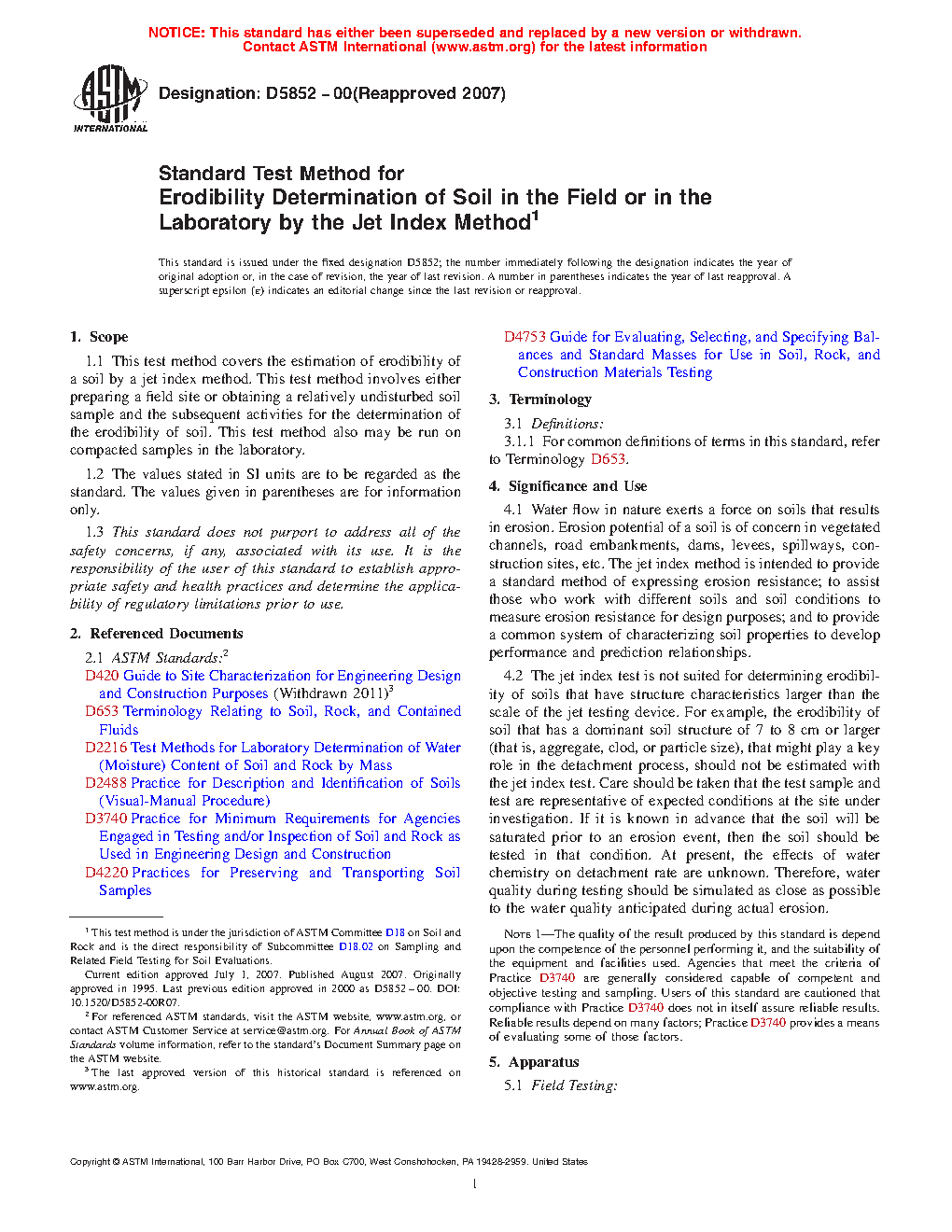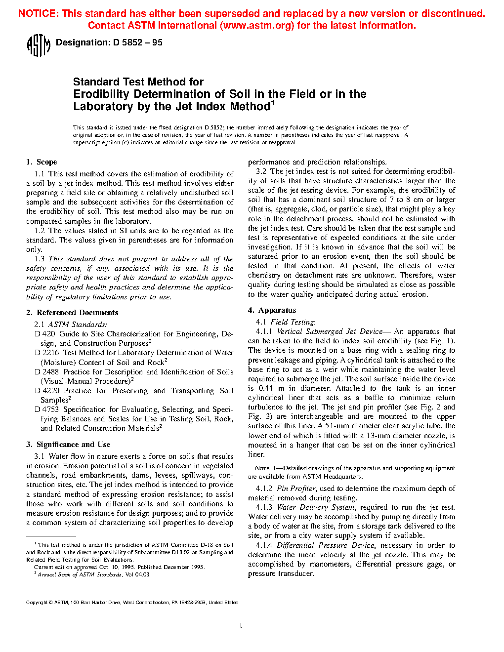 1.1 This test method covers the estimation of erodibility of a soil by a jet index method. This test method involves either preparing a field site or obtaining a relatively undisturbed soil sample and the subsequent activities for the determination of the erodibility of soil. This test method also may be run on compacted samples in the laboratory.