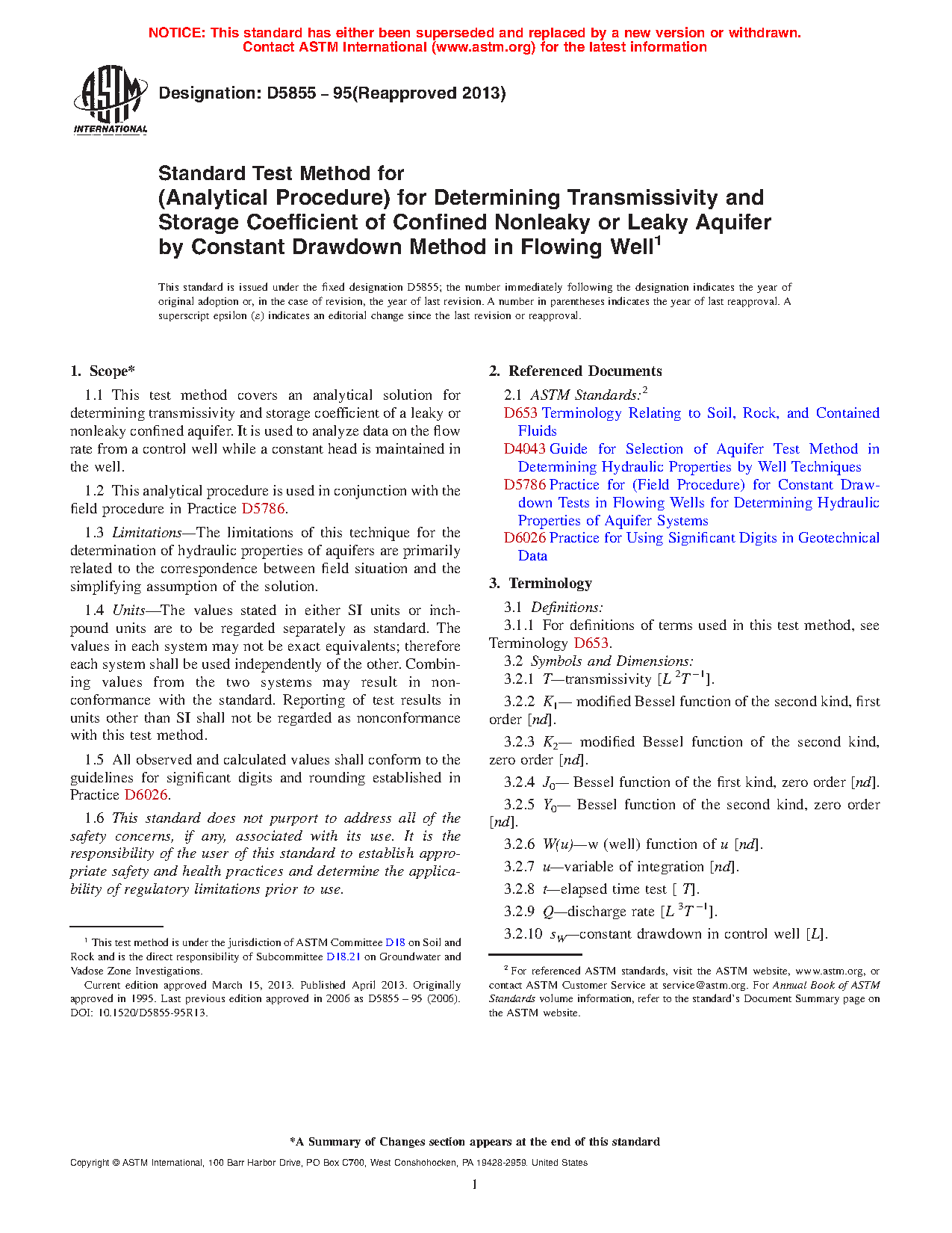 1.1 This test method covers an analytical solution for determining transmissivity and storage coefficient of a leaky or nonleaky confined aquifer. It is used to analyze data on the flow rate from a control well while a constant head is maintained in the well.