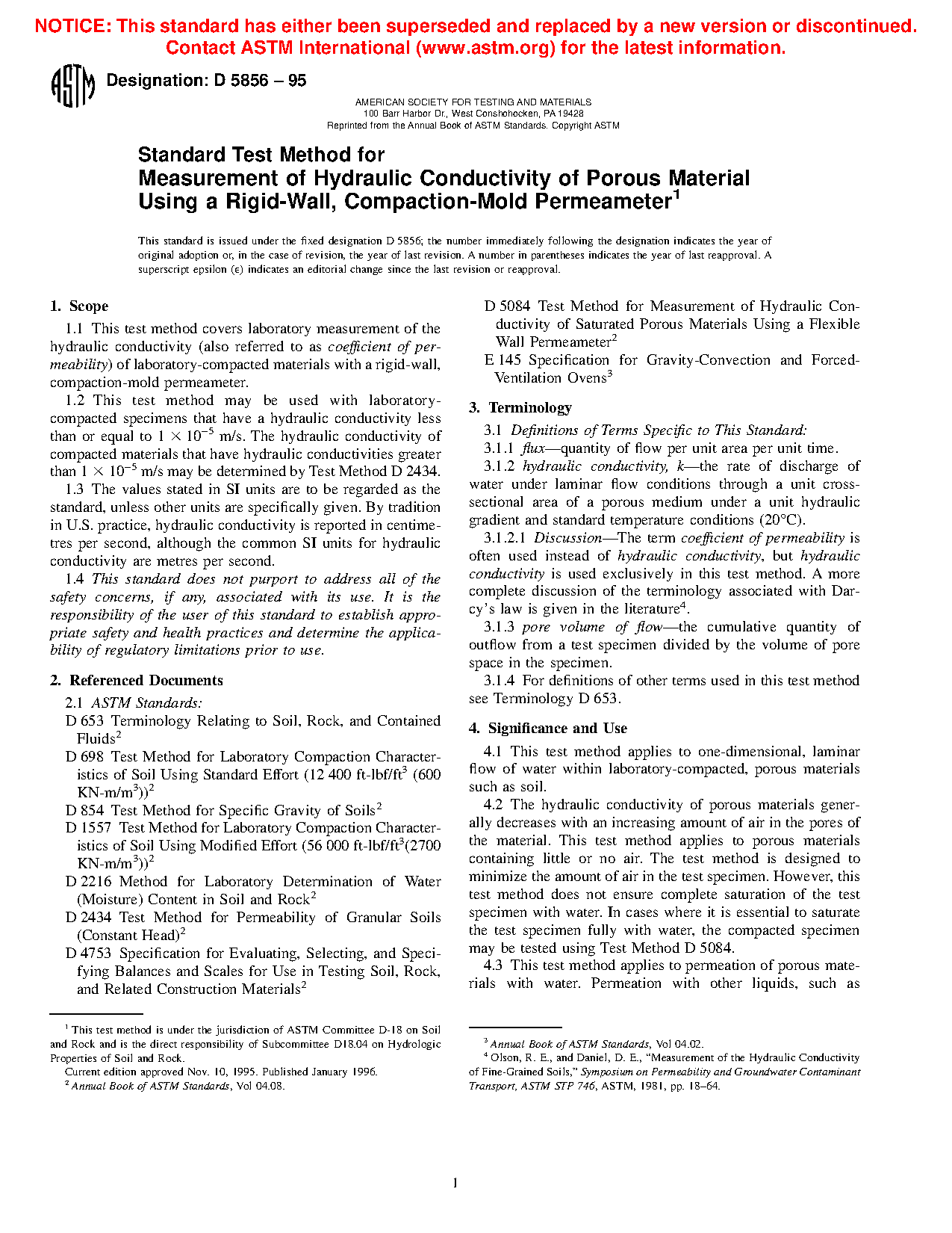 1.2 This test method may be used with laboratory-compacted specimens that have a hydraulic conductivity less than or equal to 1 × 10−5 m/s. The hydraulic conductivity of compacted materials that have hydraulic conductivities greater than 1 × 10−5 m/s may be determined by Test Method D2434.