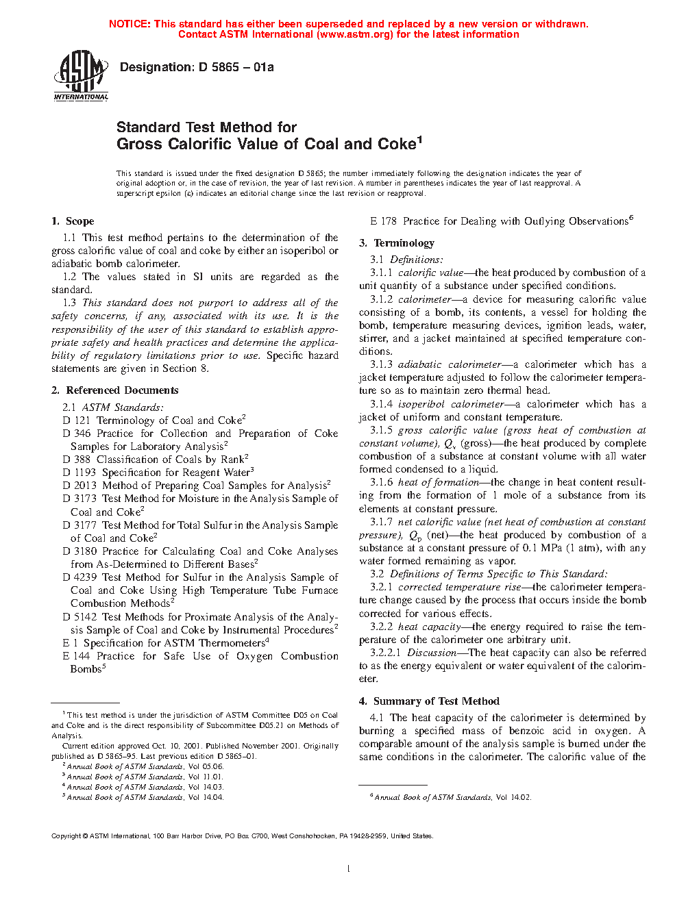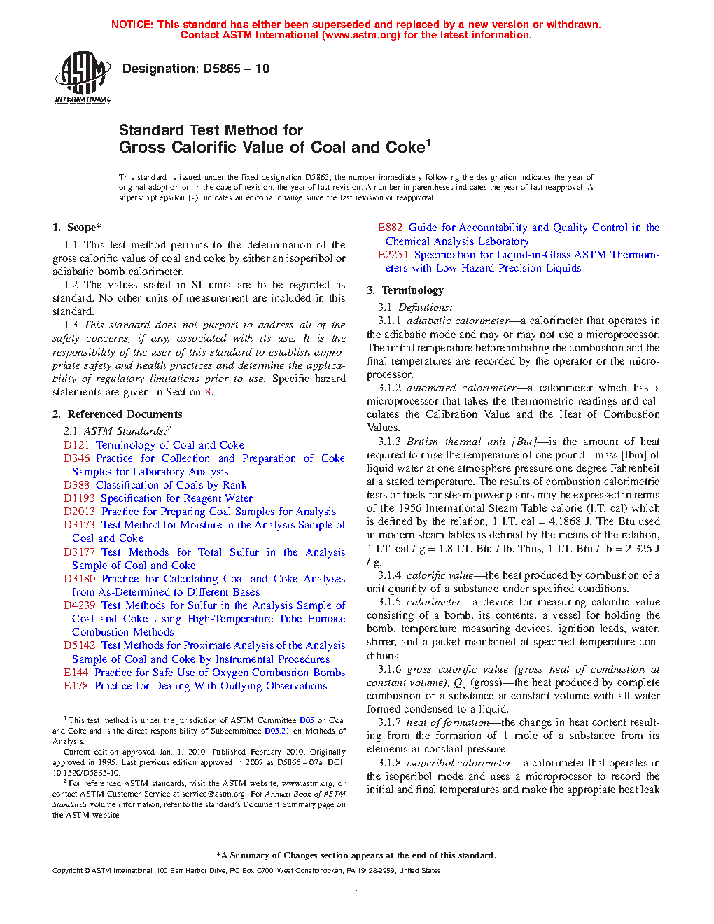 1.1 This test method pertains to the determination of the gross calorific value of coal and coke by either an isoperibol or adiabatic bomb calorimeter.