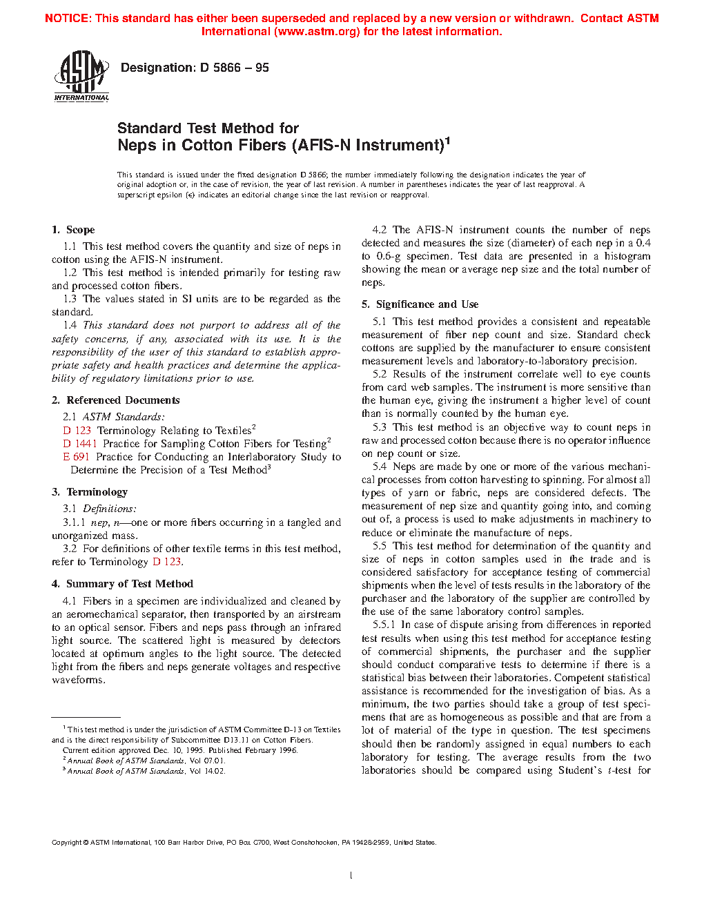 5.4 This test method provides a consistent and repeatable measurement of fiber nep count and size. Check cotton samples supplied by the manufacturer are used to verify consistent measurement levels and laboratory-to-laboratory precision.