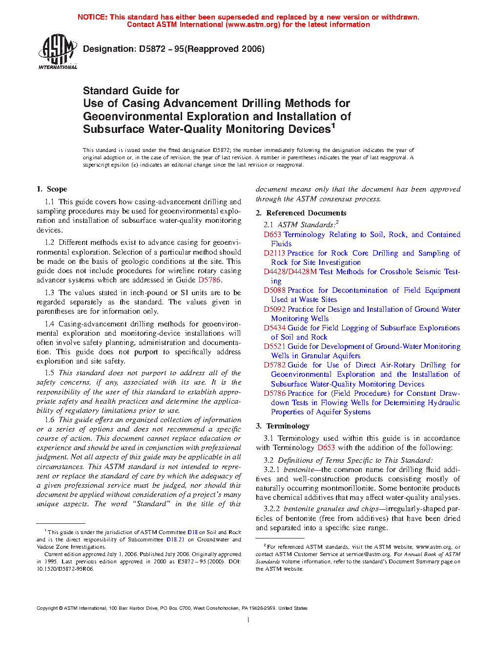 1.1 This guide covers how casing-advancement drilling and sampling procedures may be used for geoenvironmental exploration and installation of subsurface water-quality monitoring devices.