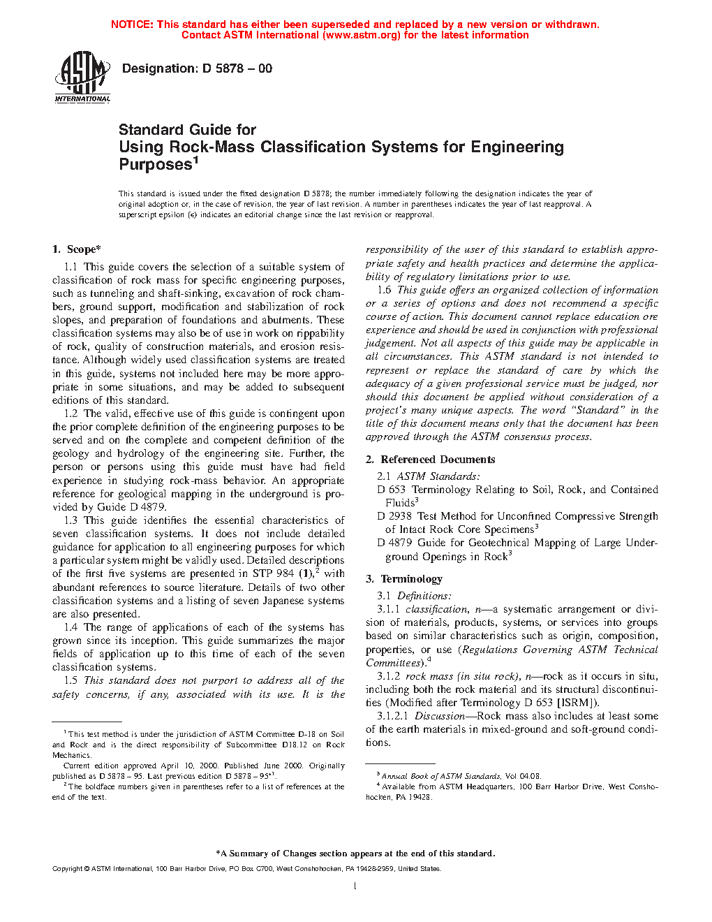 1.2 The valid, effective use of this standard is contingent upon the prior complete definition of the engineering purposes to be served and on the complete and competent definition of the geology and hydrology of the engineering site. Further, the person or persons using this standard shall have had field experience in studying rock-mass behavior. An appropriate reference for geotechnical mapping of large underground openings in rock is provided by Guide D4879.
