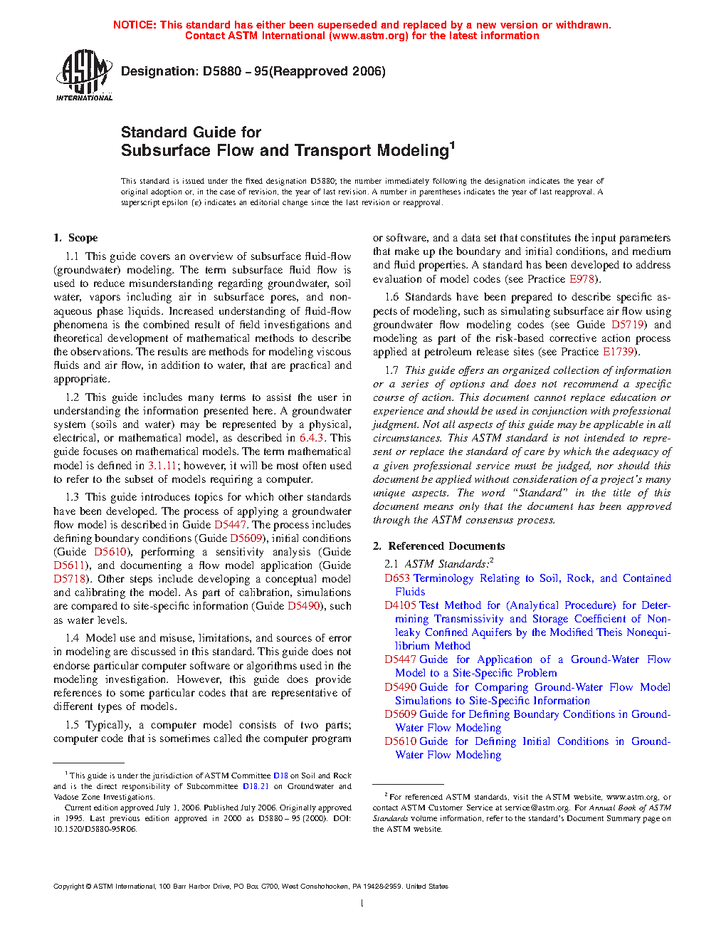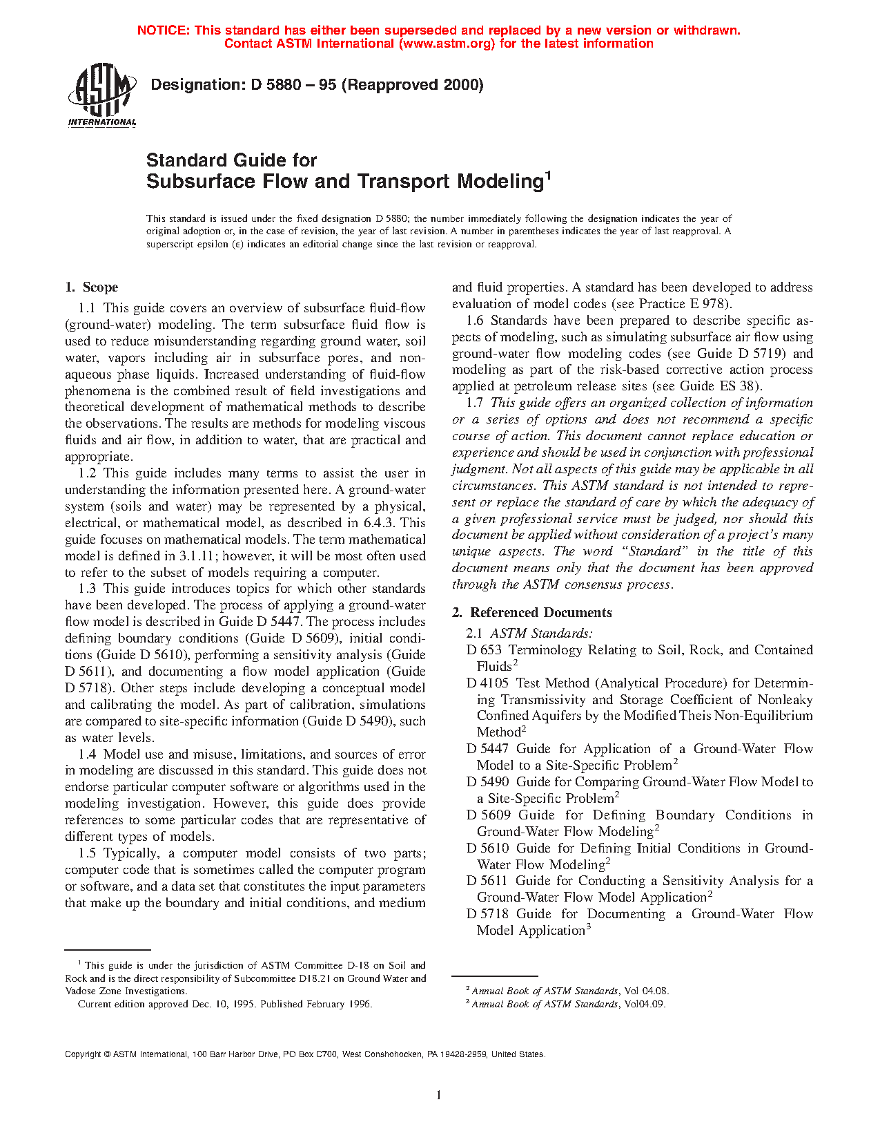 1.6 Standards have been prepared to describe specific aspects of modeling, such as simulating subsurface air flow using groundwater flow modeling codes (see Guide D5719) and modeling as part of the risk-based corrective action process applied at petroleum release sites (see Practice E1739).