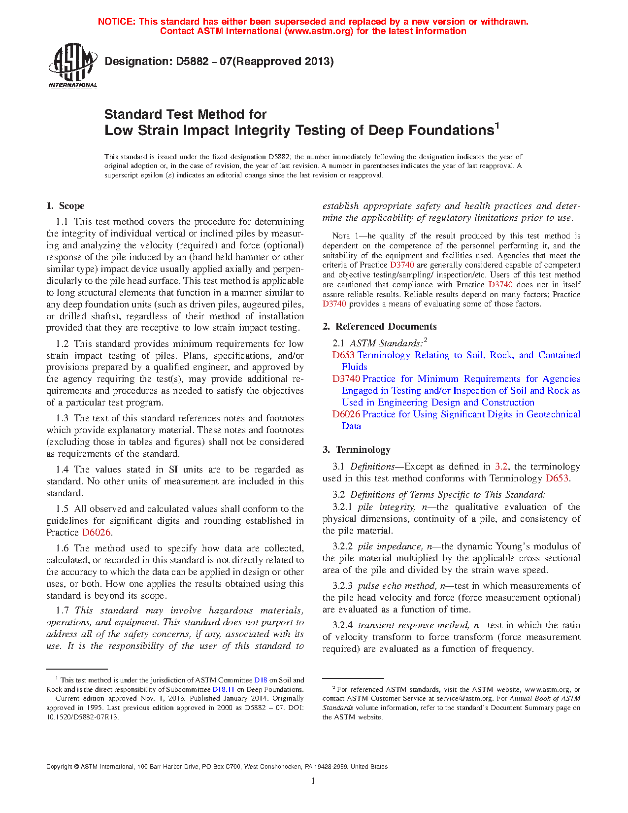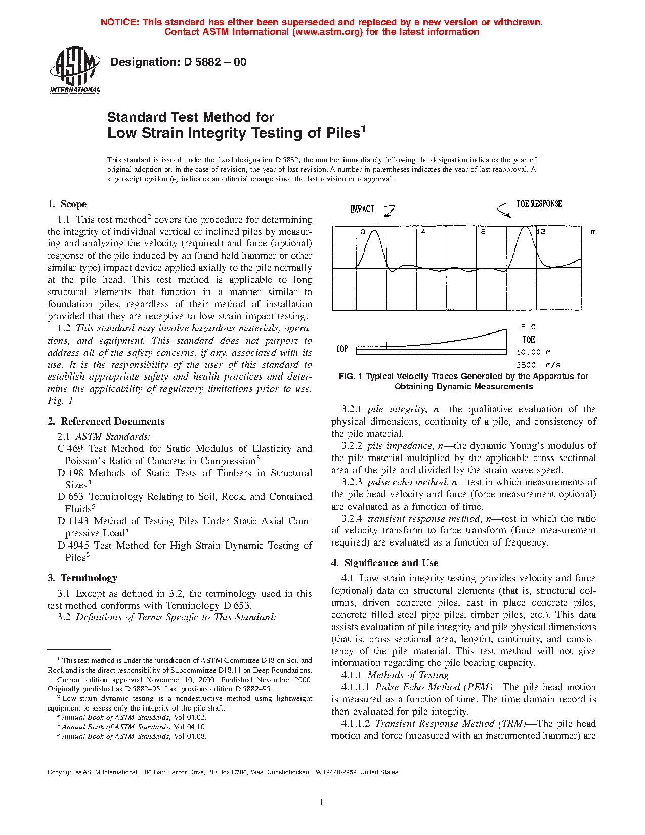 1.1 This test method covers the procedure for determining the integrity of individual vertical or inclined piles by measuring and analyzing the velocity (required) and force (optional) response of the pile induced by an (hand held hammer or other similar type) impact device usually applied axially and perpendicularly to the pile head surface. This test method is applicable to long structural elements that function in a manner similar to any deep foundation units (such as driven piles, augeured piles, or drilled shafts), regardless of their method of installation provided that they are receptive to low strain impact testing.