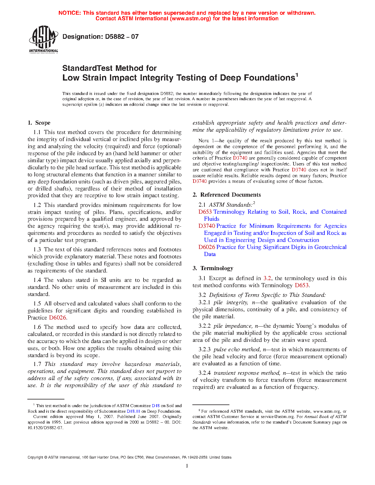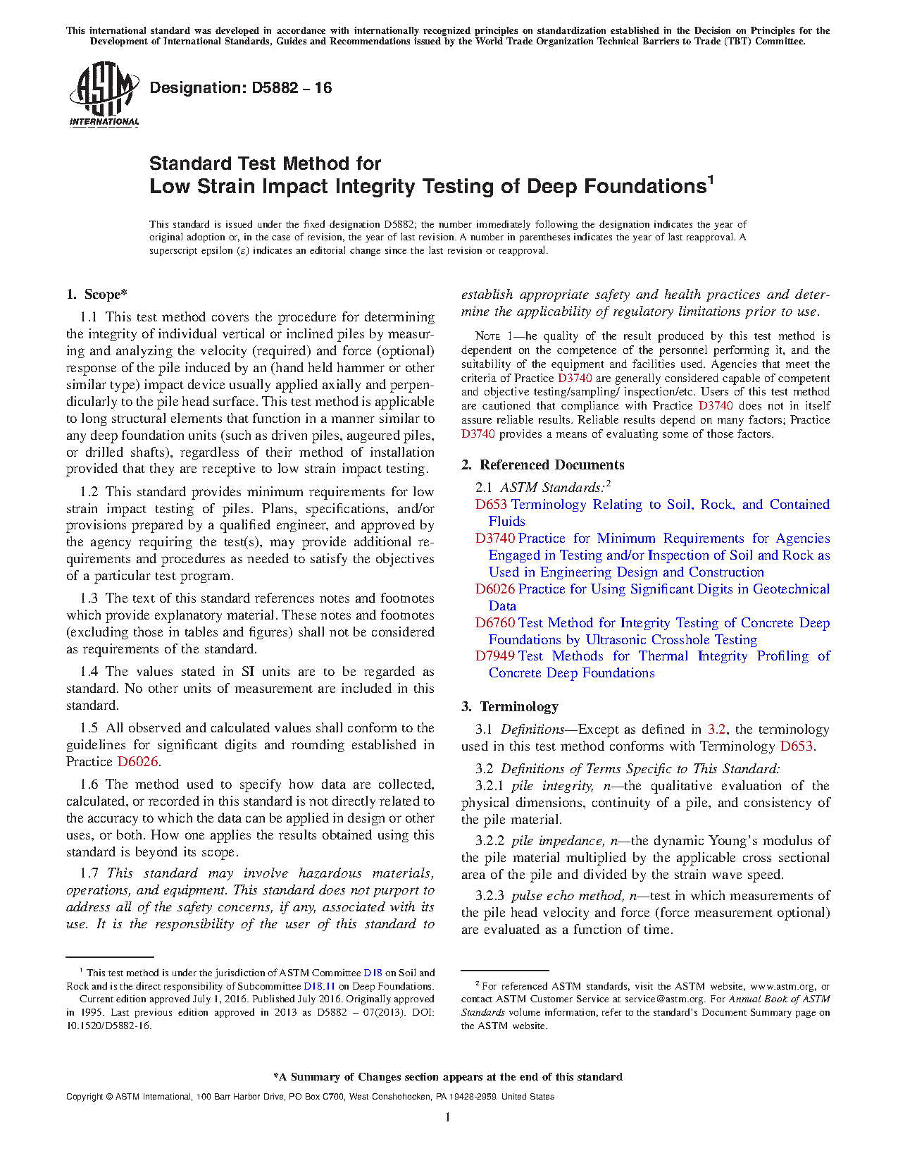 1.2 This standard provides minimum requirements for low strain impact testing of piles. Plans, specifications, and/or provisions prepared by a qualified engineer, and approved by the agency requiring the test(s), may provide additional requirements and procedures as needed to satisfy the objectives of a particular test program.