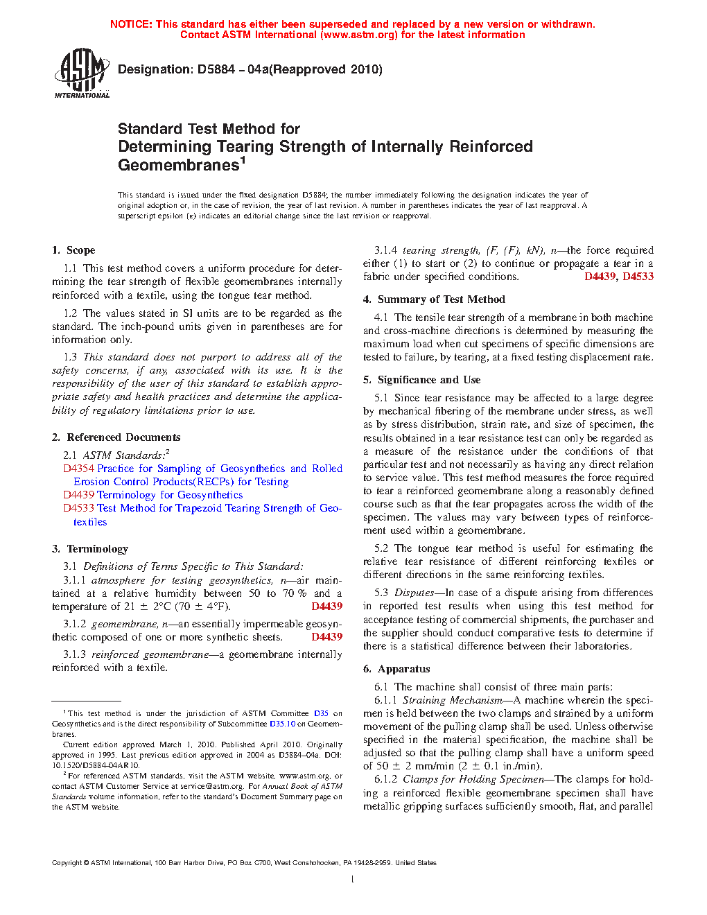 1.1 This test method covers a uniform procedure for determining the tear strength of flexible geomembranes internally reinforced with a textile, using the tongue tear method.