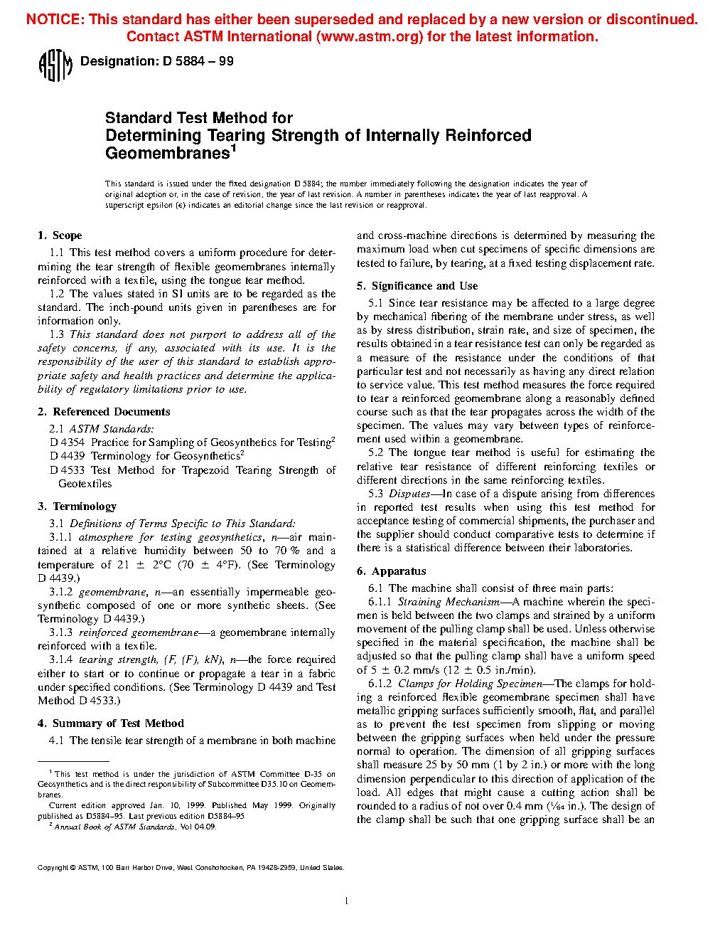 Since tear resistance may be affected to a large degree by mechanical fibering of the membrane under stress, as well as by stress distribution, strain rate, and size of specimen, the results obtained in a tear resistance test can only be regarded as a measure of the resistance under the conditions of that particular test and not necessarily as having any direct relation to service value. This test method measures the force required to tear a reinforced geomembrane along a reasonably defined course such as that the tear propagates across the width of the specimen. The values may vary between types of reinforcement used within a geomembrane.