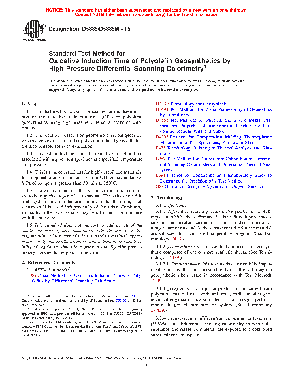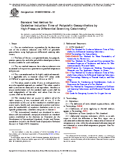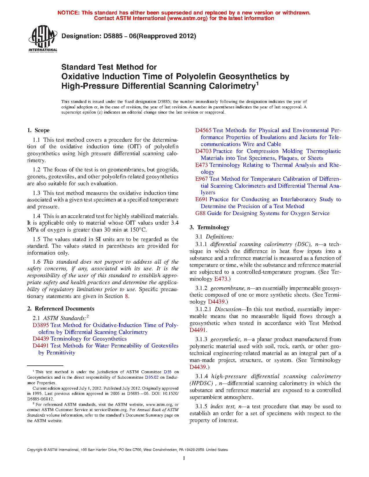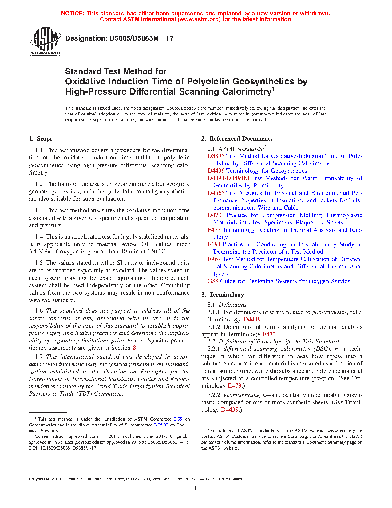 1.1 This test method covers a procedure for the determination of the oxidative induction time (OIT) of polyolefin geosynthetics using high pressure differential scanning calorimetry.