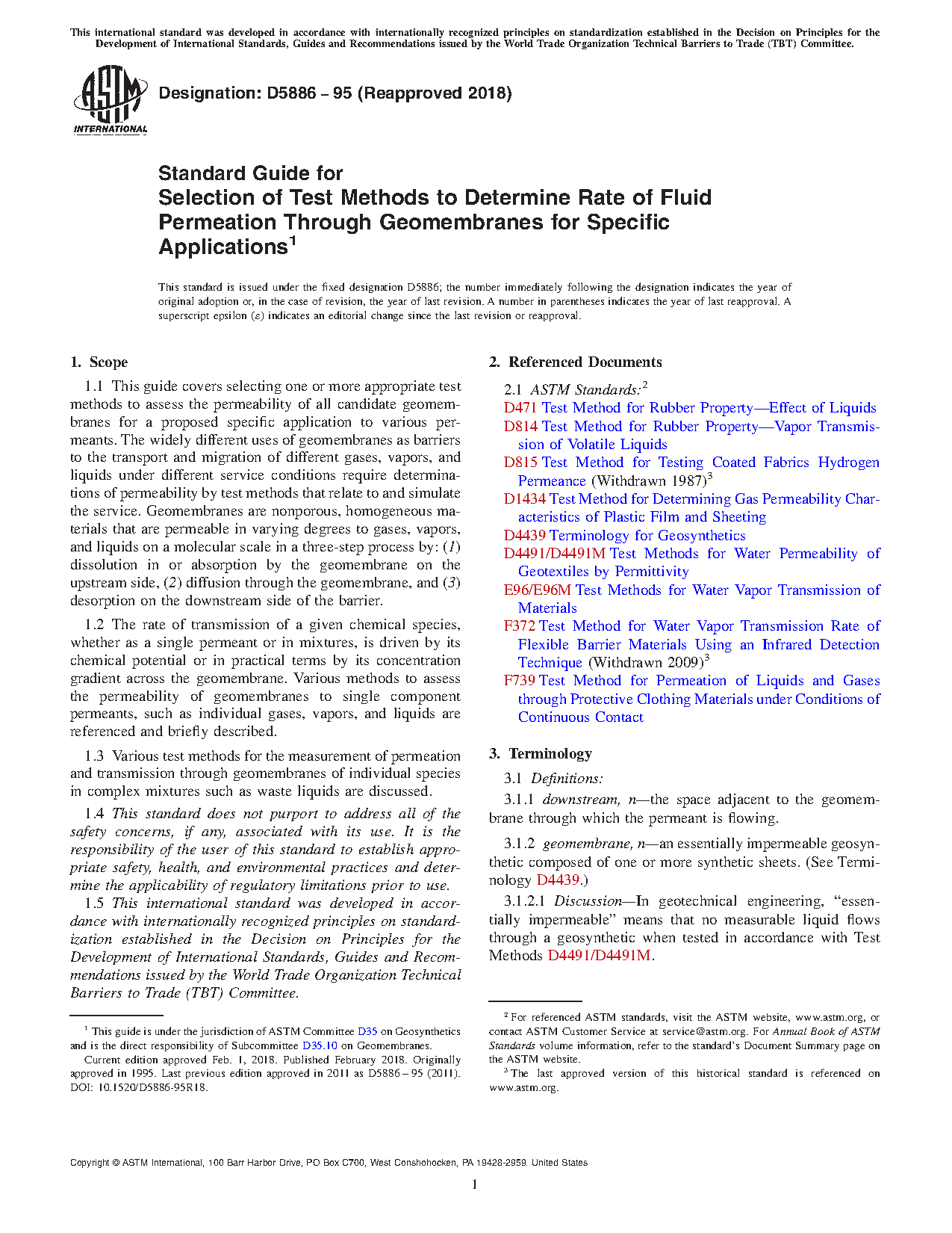 This guide discusses the mechanism of permeation of mobile chemical species through geomembranes and the permeability tests that are relevant to various types of applications and permeating species. Specific tests for the permeability of geomembranes to both single-component fluids and multicomponent fluids that contain a variety of permeants are described and discussed.
