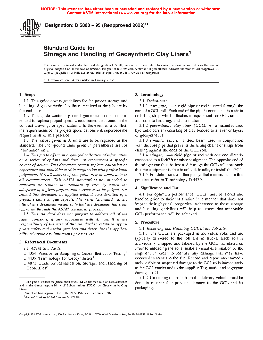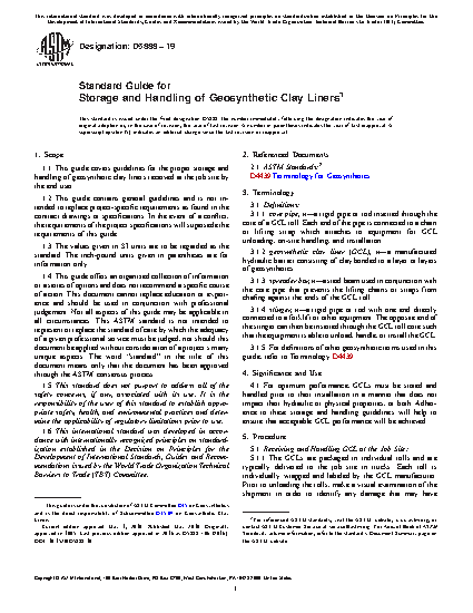 1.1 This guide covers guidelines for the proper storage and handling of geosynthetic clay liners received at the job site by the end user.