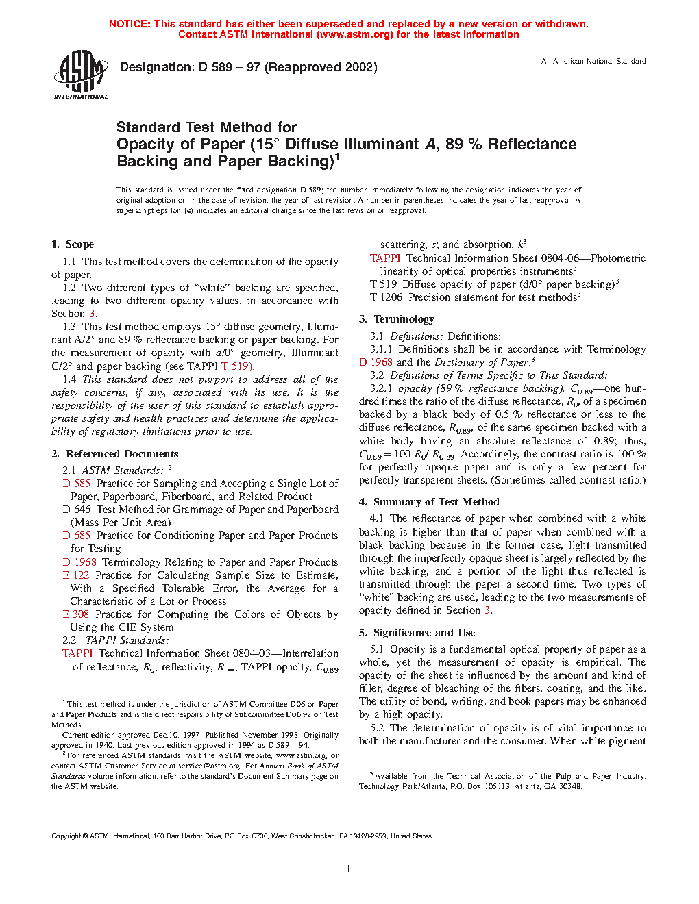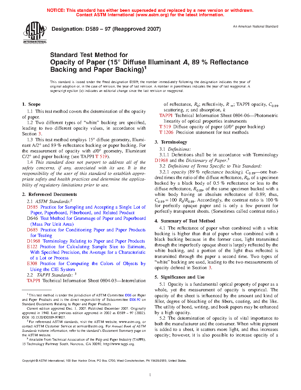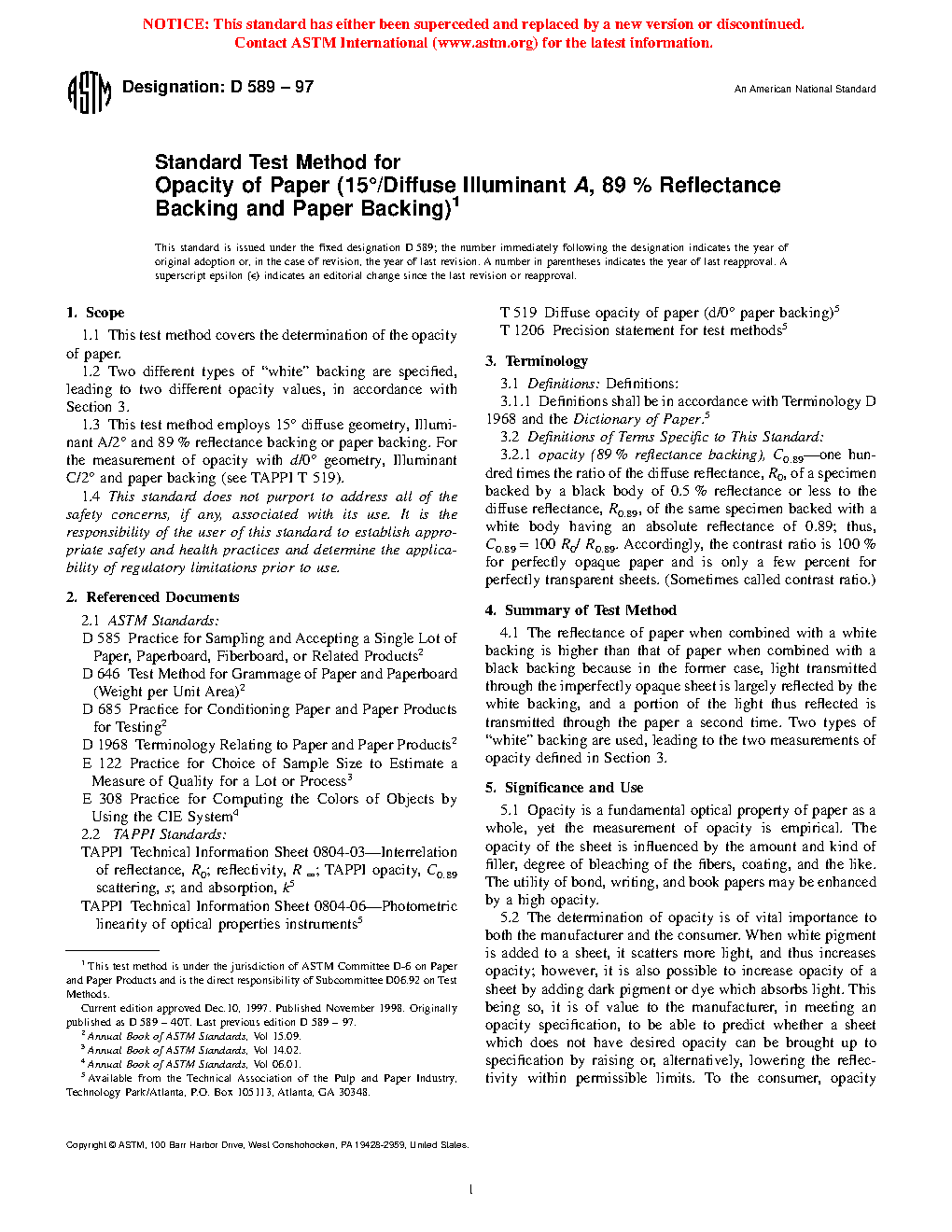 1.3 This test method employs 15° diffuse geometry, Illuminant A/2° and 89% reflectance backing or paper backing. For the measurement of opacity with d/0° geometry, Illuminant C/2° and paper backing (see TAPPI T 519).
