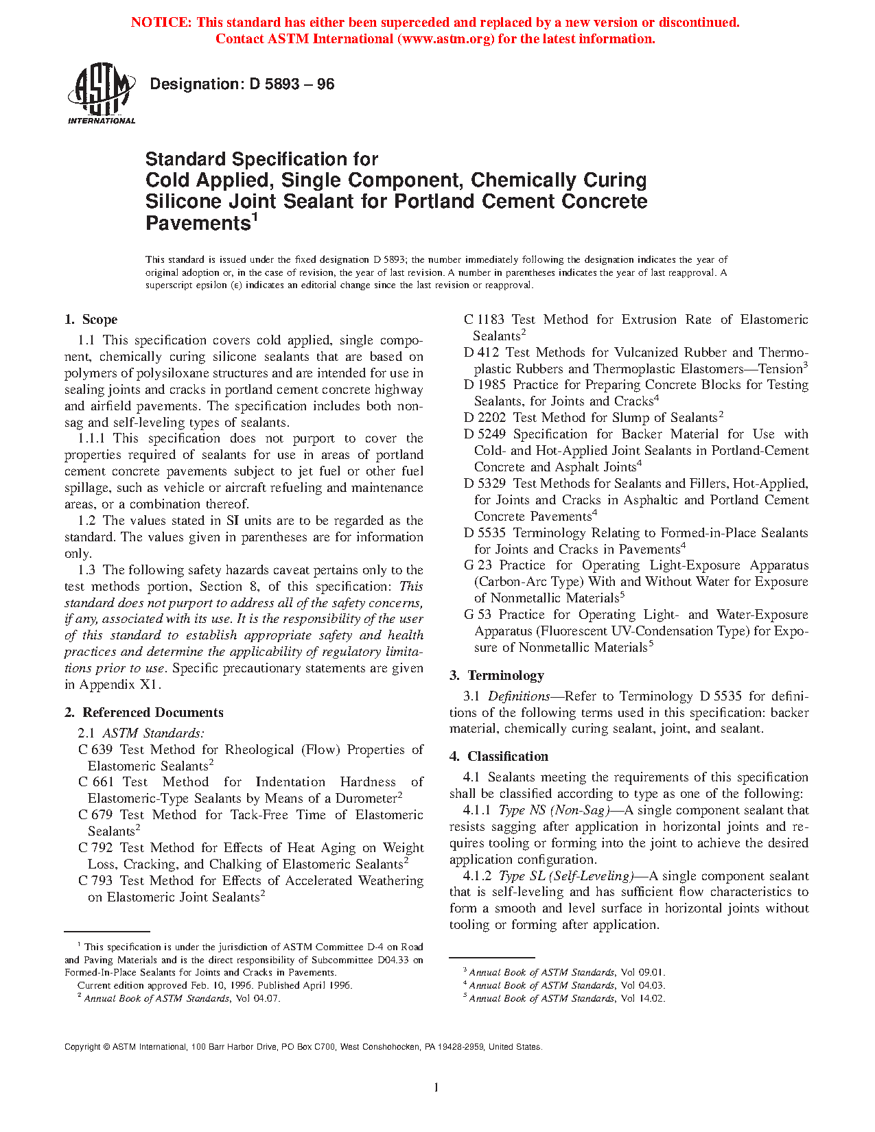 1.1 This specification covers cold applied, single component, chemically curing silicone sealants that are based on polymers of polysiloxane structures and are intended for use in sealing joints and cracks in portland cement concrete highway and airfield pavements. The specification includes both non-sag and self-leveling types of sealants.