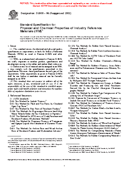 This specification covers the chemical and physical quality specifications or requirements, or both, for Industry Reference Materials (IRMs) as cited in a certain practice and other standards. IRMs as evaluated and referenced in the said certain practice are vitally important to conduct product, specification and development testing in the rubber and carbon black industries. IRMs are vitally important in product and specification testing, in research and development work, in technical service work, and in quality control operations in the rubber and carbon black industries. They are especially valuable for referee purposes. Many ASTM rubber standards for the evaluation of natural or synthetic rubber require the use of specific IRMs in their test recipes for better laboratory repeatability and reproducibility. Some of the chemicals or materials specified include tetramethyl thiuram disulfide, benzothiazyl disulfide, N-tert-butyl-benzothiazole sulfenamide, stearic acid, sulfur, naphthenic process oil, zinc oxide, butyl rubber, petroleum oil, ammoniated latex antigenic protein, and rabbit anti AL antisera.