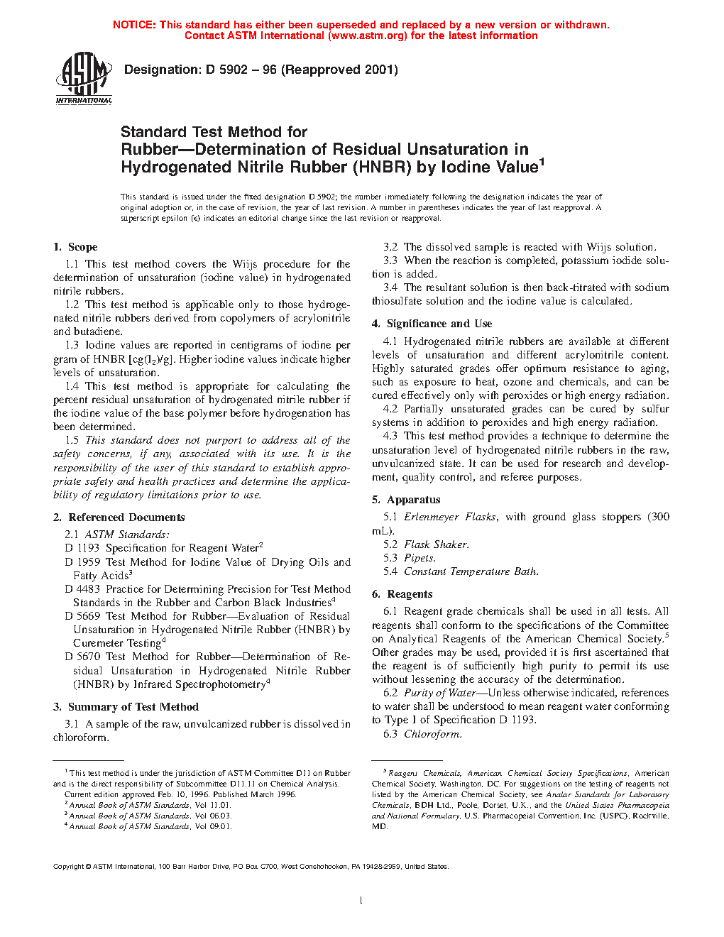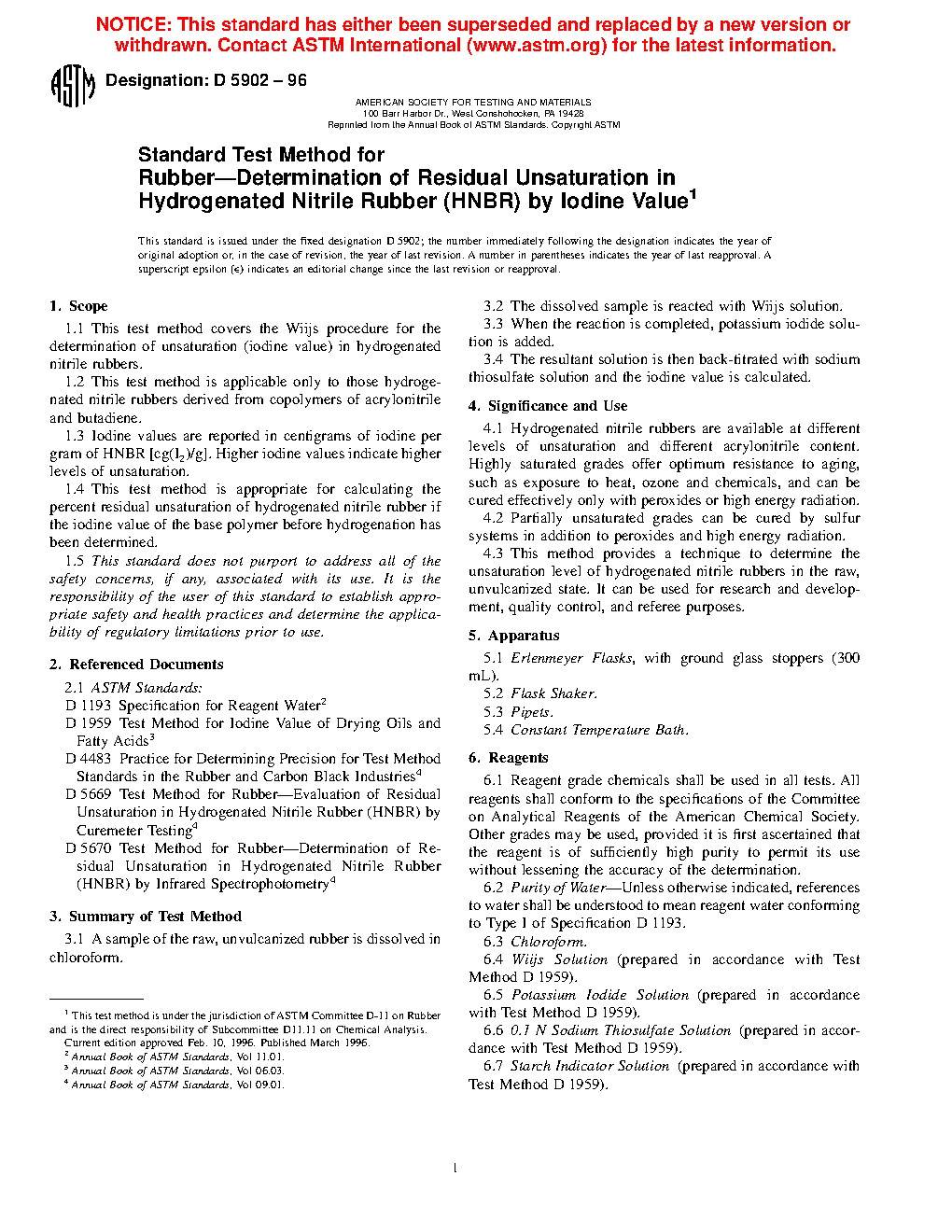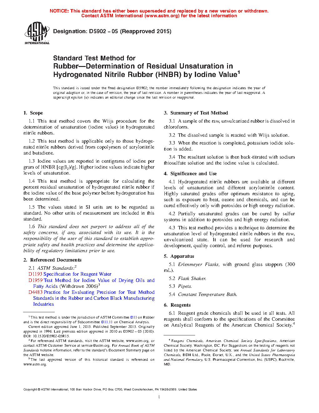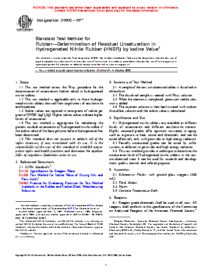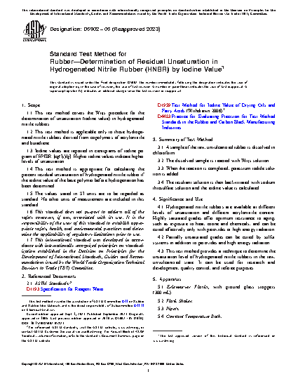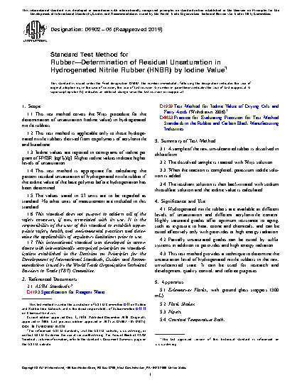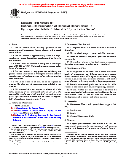 1.4 This test method is appropriate for calculating the percent residual unsaturation of hydrogenated nitrile rubber if the iodine value of the base polymer before hydrogenation has been determined.
