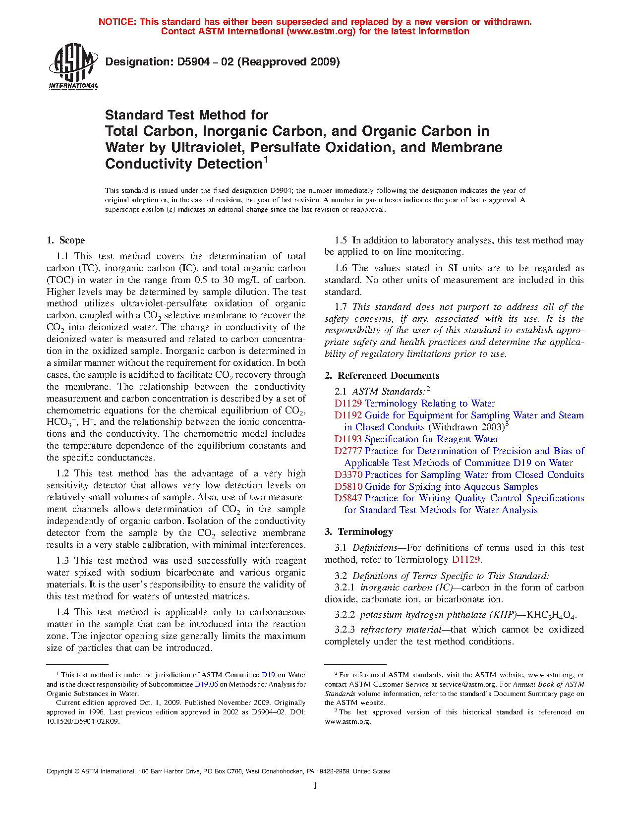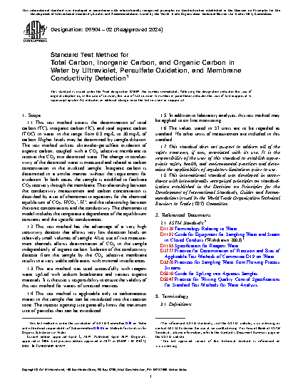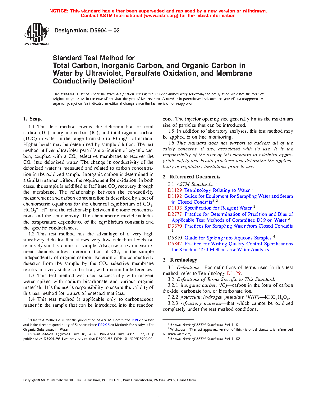 1.1 This test method covers the determination of total carbon (TC), inorganic carbon (IC), and total organic carbon (TOC) in water in the range from 0.5 to 30 mg/L of carbon. Higher levels may be determined by sample dilution. The test method utilizes ultraviolet-persulfate oxidation of organic carbon, coupled with a CO2 selective membrane to recover the CO2 into deionized water. The change in conductivity of the deionized water is measured and related to carbon concentration in the oxidized sample. Inorganic carbon is determined in a similar manner without the requirement for oxidation. In both cases, the sample is acidified to facilitate CO2 recovery through the membrane. The relationship between the conductivity measurement and carbon concentration is described by a set of chemometric equations for the chemical equilibrium of CO2, HCO3−, H+, and the relationship between the ionic concentrations and the conductivity. The chemometric model includes the temperature dependence of the equilibrium constants and the specific conductances.