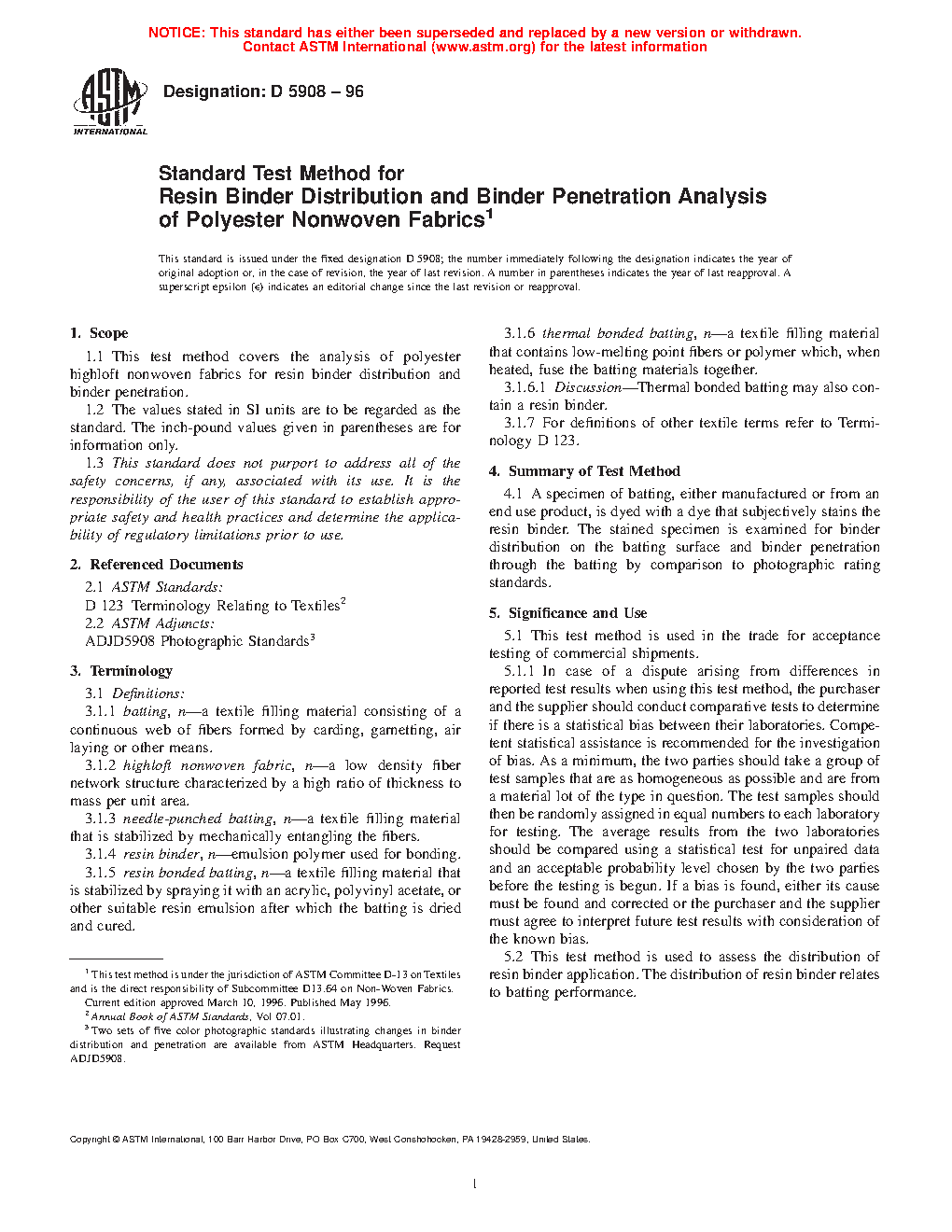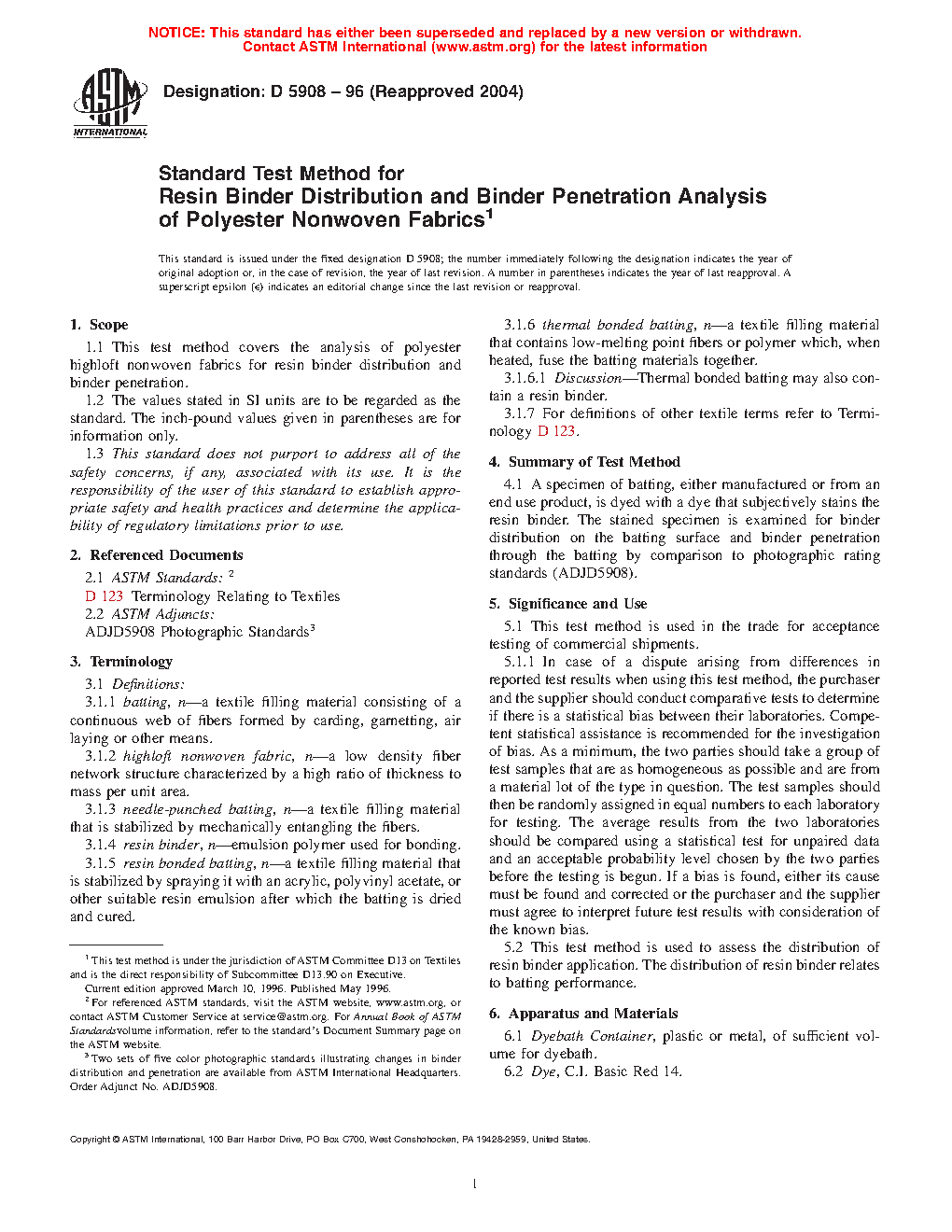 1.1 This test method covers the analysis of polyester highloft nonwoven fabrics for resin binder distribution and binder penetration.