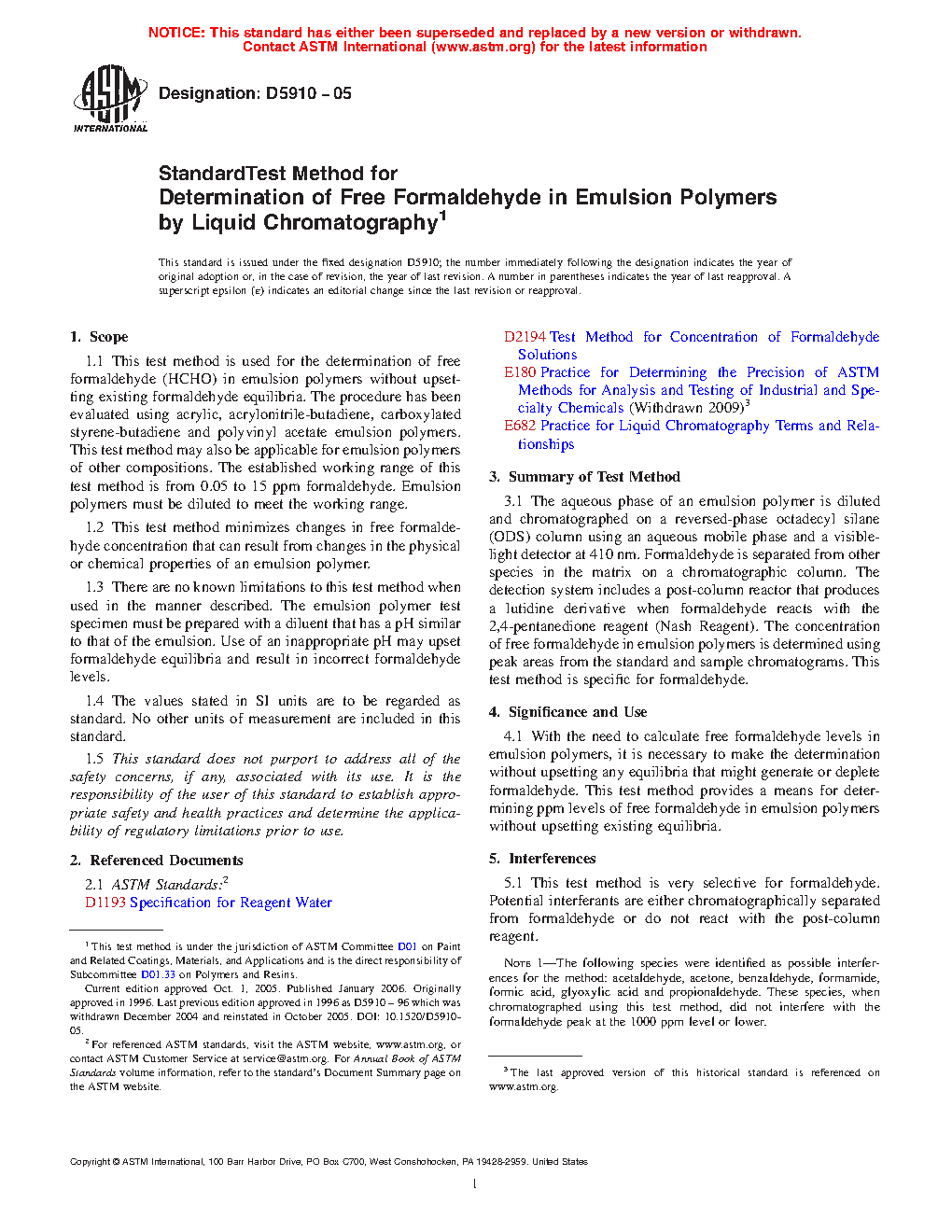 1.3 There are no known limitations to this test method when used in the manner described. The emulsion polymer test specimen must be prepared with a diluent that has a pH similar to that of the emulsion. Use of an inappropriate pH may upset formaldehyde equilibria and result in incorrect formaldehyde levels.