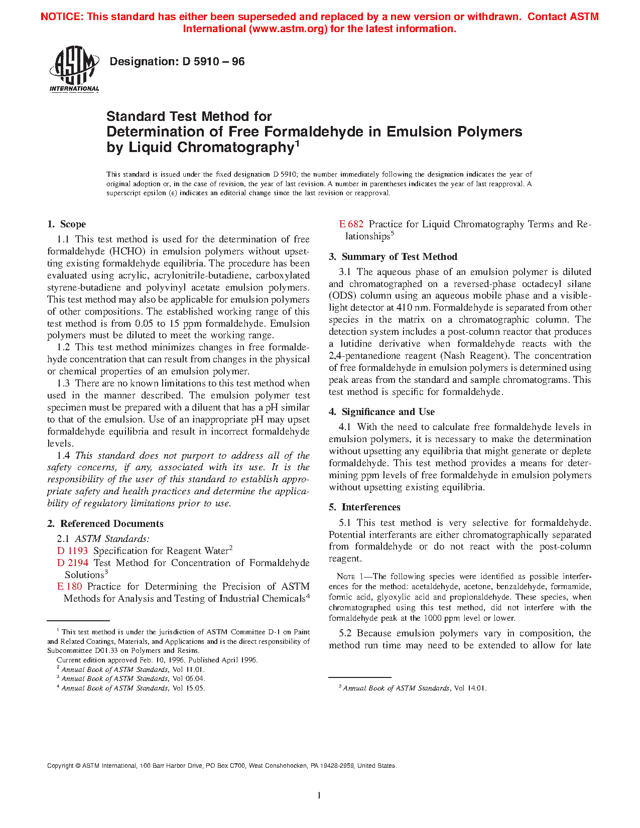 1.3 There are no known limitations to this test method when used in the manner described. The emulsion polymer test specimen must be prepared with a diluent that has a pH similar to that of the emulsion. Use of an inappropriate pH may upset formaldehyde equilibria and result in incorrect formaldehyde levels.