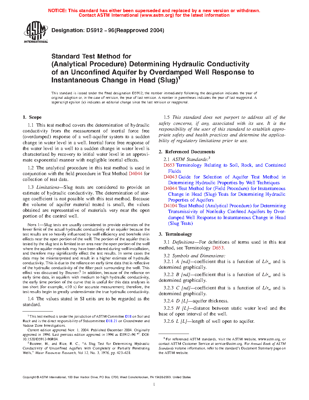Note 1: Slug tests are usually considered to provide estimates of the lower limit of the actual hydraulic conductivity of an aquifer because the test results are so heavily influenced by well efficiency and borehole skin effects near the open portion of the well. The portion of the aquifer that is tested by the slug test is limited to an area near the open portion of the well where the aquifer materials may have been altered during well installation, and therefore may significantly impact the test results. In some cases, the data may be misinterpreted and result in a higher estimate of hydraulic conductivity. This is due to the reliance on early time data that is reflective of the hydraulic conductivity of the filter pack surrounding the well. This effect was discussed by Bouwer (1).2 In addition, because of the reliance on early time data, in aquifers with medium to high hydraulic conductivity, the early time portion of the curve that is useful for this data analyses is too short (for example, <10 s) for accurate measurement; therefore, the test results begin to greatly underestimate the true hydraulic conductivity.