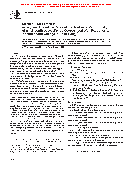 1.1 This practice covers the determination of hydraulic conductivity from the measurement of inertial force free (overdamped) response of a well-aquifer system to a sudden change in water level in a well. Inertial force free response of the water level in a well to a sudden change in water level is characterized by recovery to initial water level in an approximate exponential manner with negligible inertial effects.
