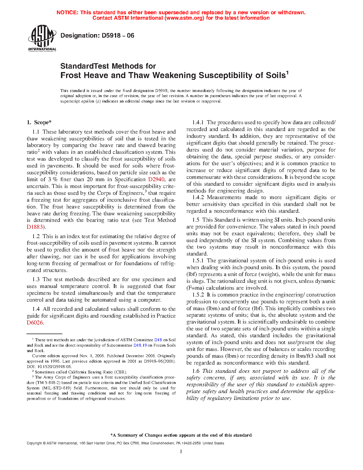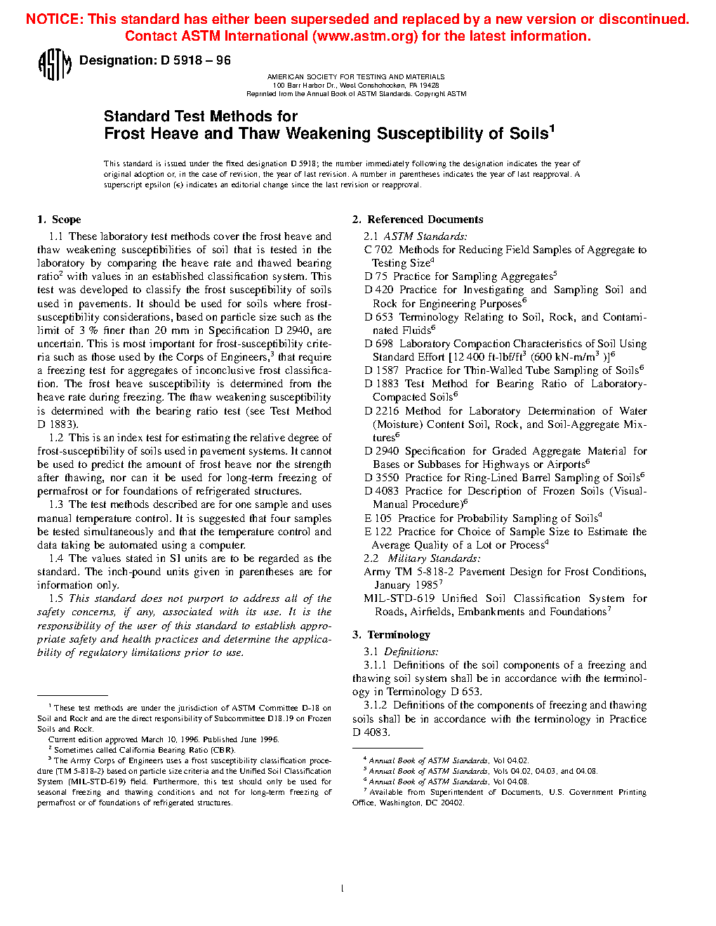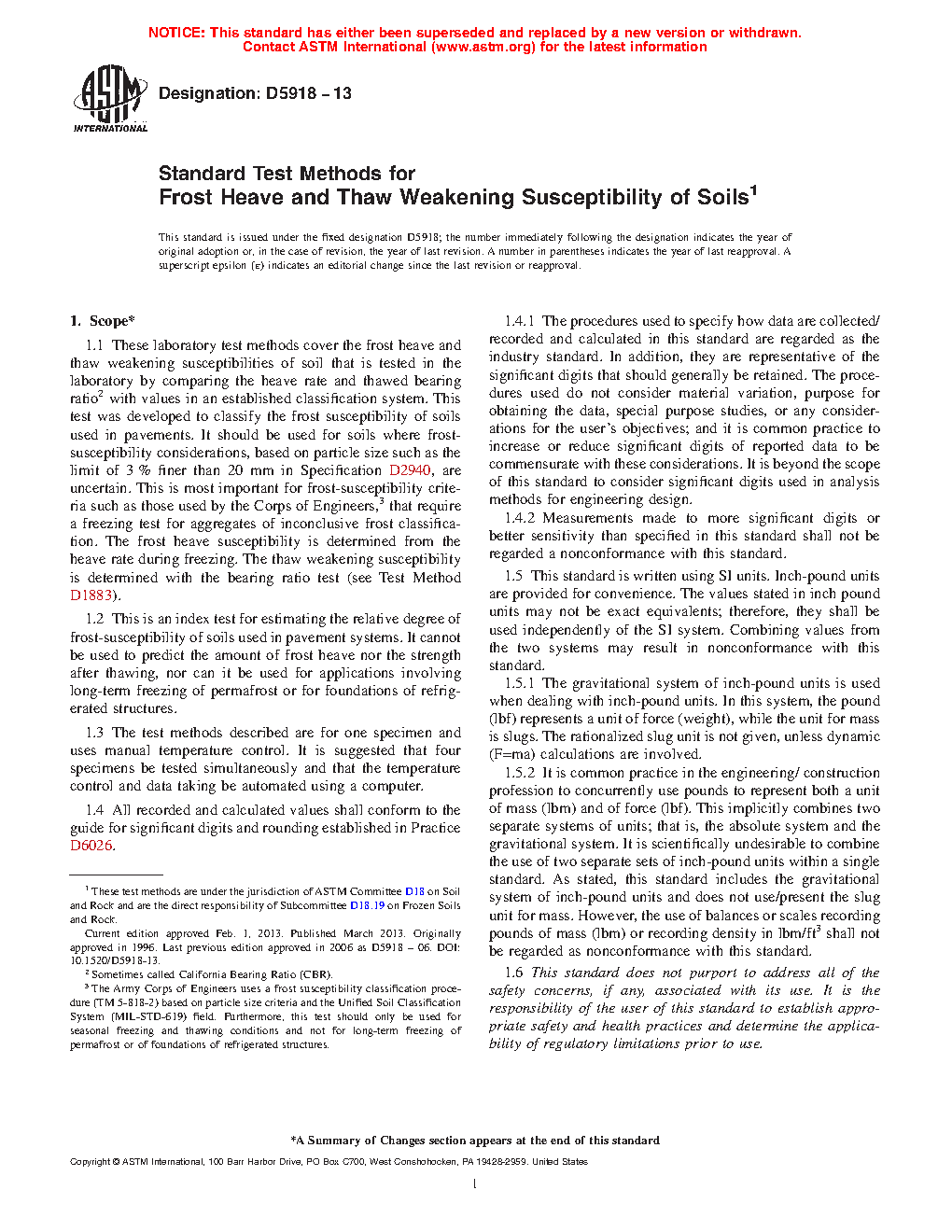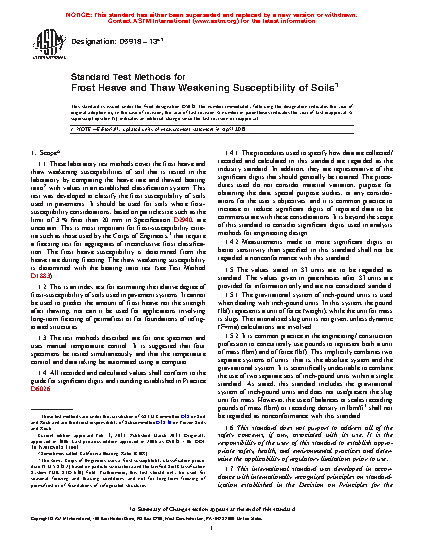 1.1 These laboratory test methods cover the frost heave and thaw weakening susceptibilities of soil that is tested in the laboratory by comparing the heave rate and thawed bearing ratio2 with values in an established classification system. This test was developed to classify the frost susceptibility of soils used in pavements. It should be used for soils where frost-susceptibility considerations, based on particle size such as the limit of 3 % finer than 20 mm in Specification D2940, are uncertain. This is most important for frost-susceptibility criteria such as those used by the Corps of Engineers,3 that require a freezing test for aggregates of inconclusive frost classification. The frost heave susceptibility is determined from the heave rate during freezing. The thaw weakening susceptibility is determined with the bearing ratio test (see Test Method D1883).