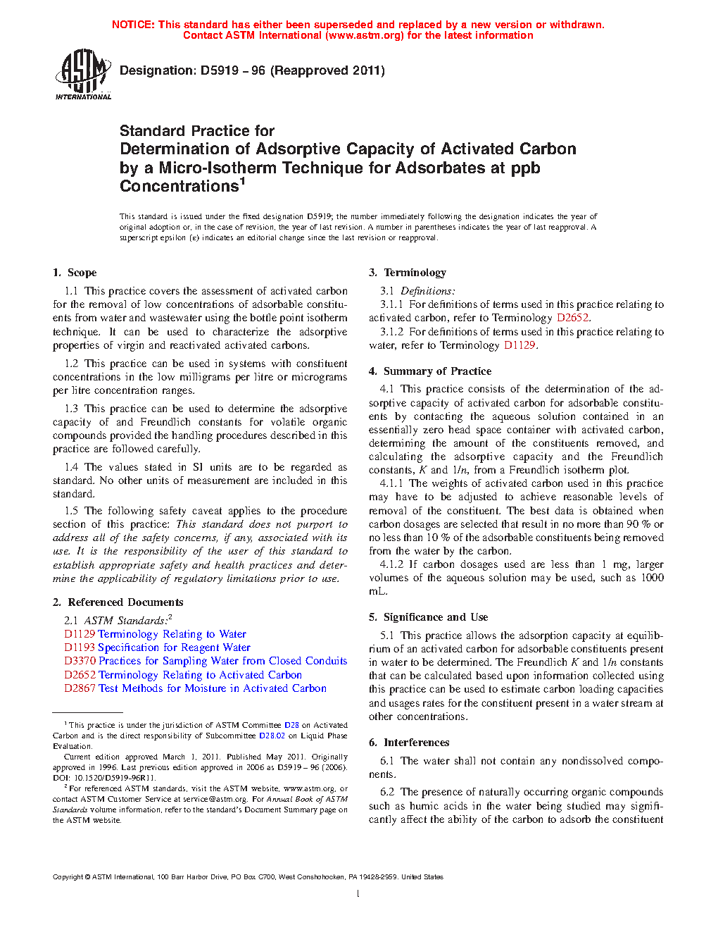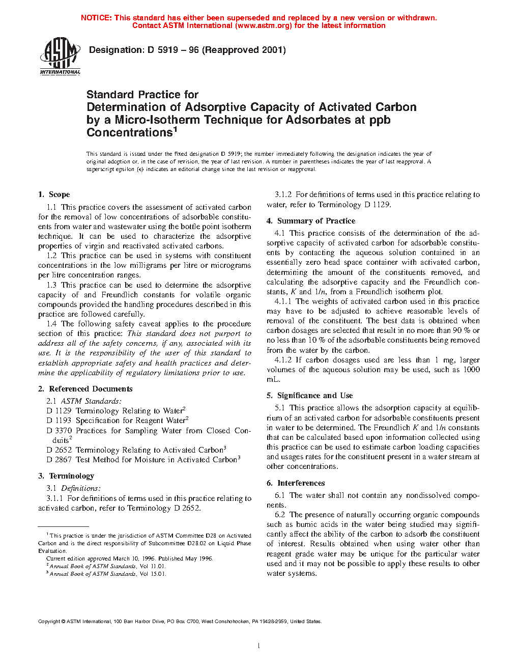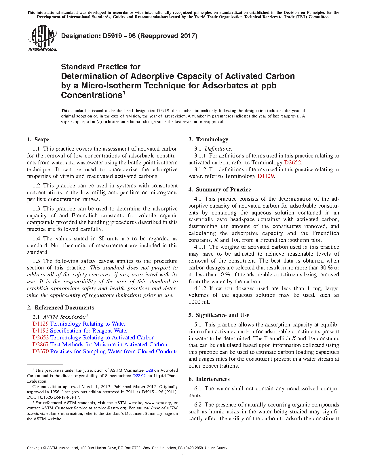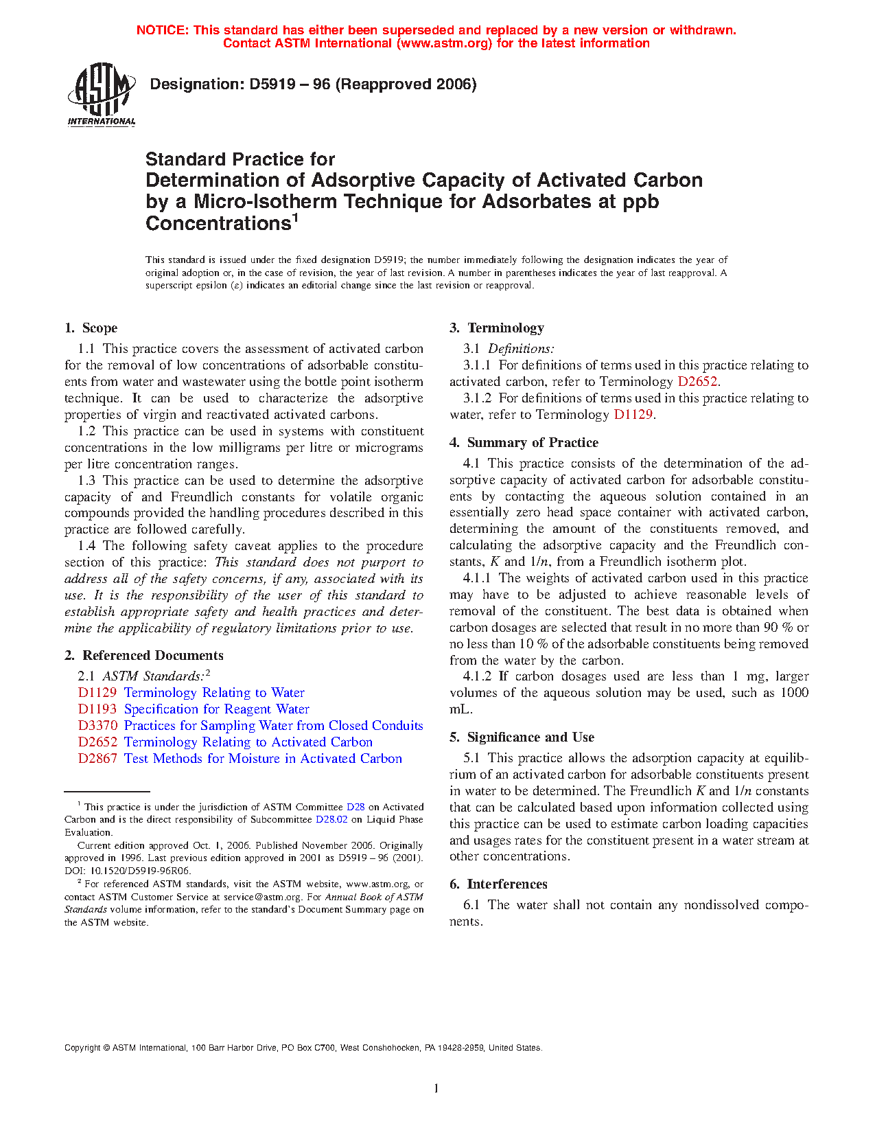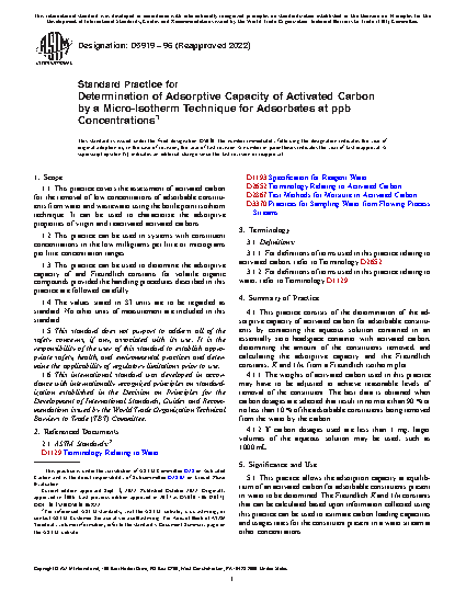 1.1 This practice covers the assessment of activated carbon for the removal of low concentrations of adsorbable constituents from water and wastewater using the bottle point isotherm technique. It can be used to characterize the adsorptive properties of virgin and reactivated activated carbons.