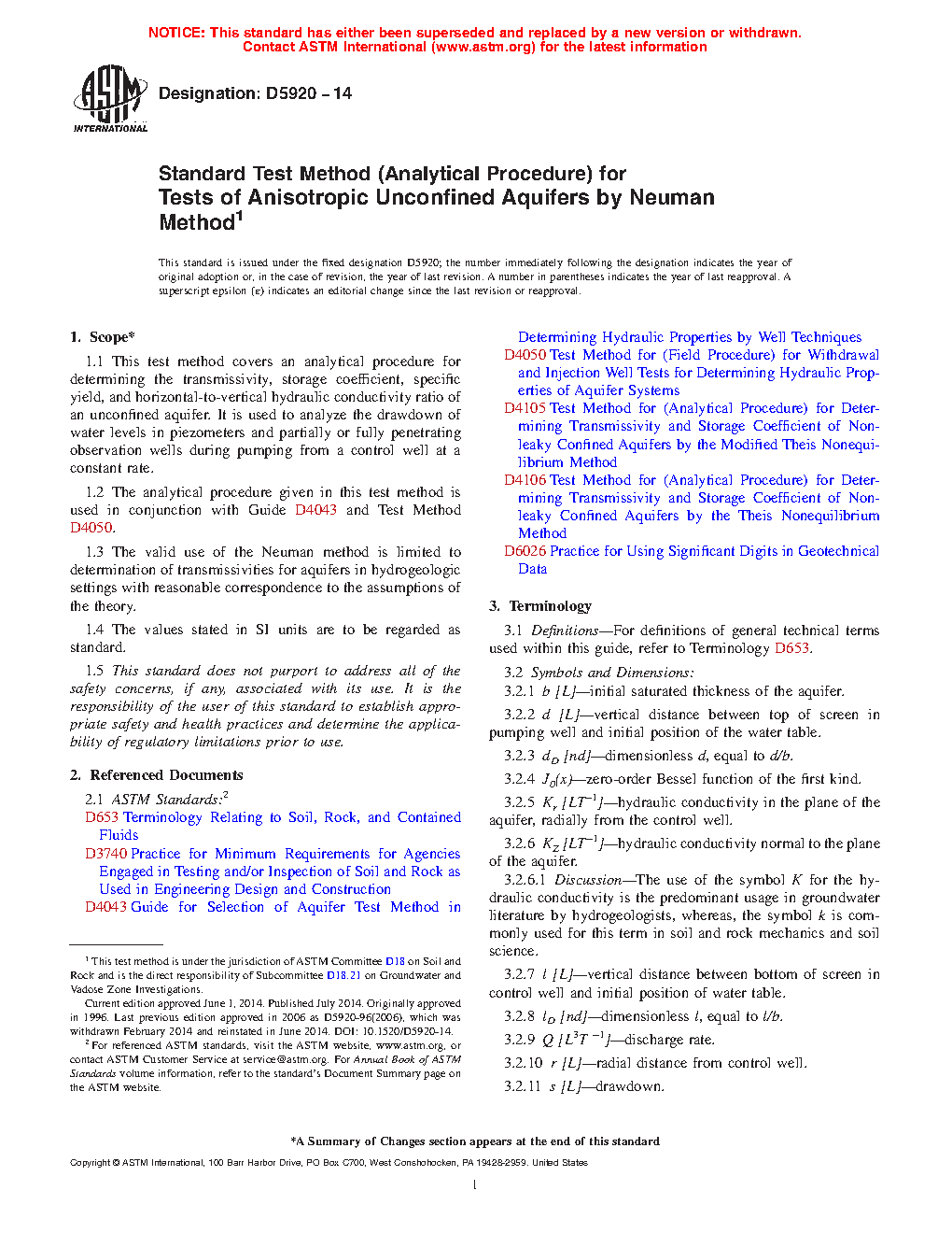 1.1 This practice covers an analytical procedure for determining the transmissivity, storage coefficient, specific yield, and horizontal-to-vertical hydraulic conductivity ratio of an unconfined aquifer. It is used to analyze the drawdown of water levels in piezometers and partially or fully penetrating observation wells during pumping from a control well at a constant rate.