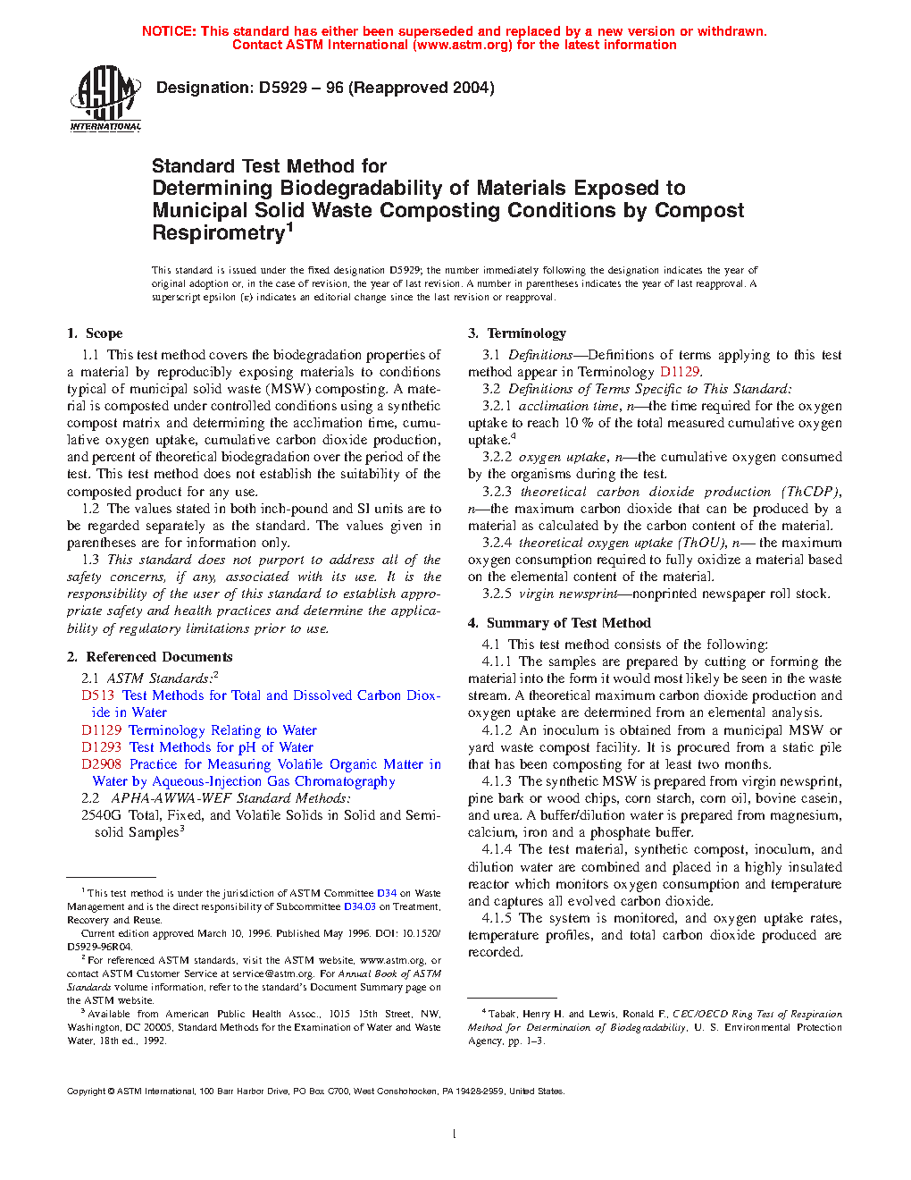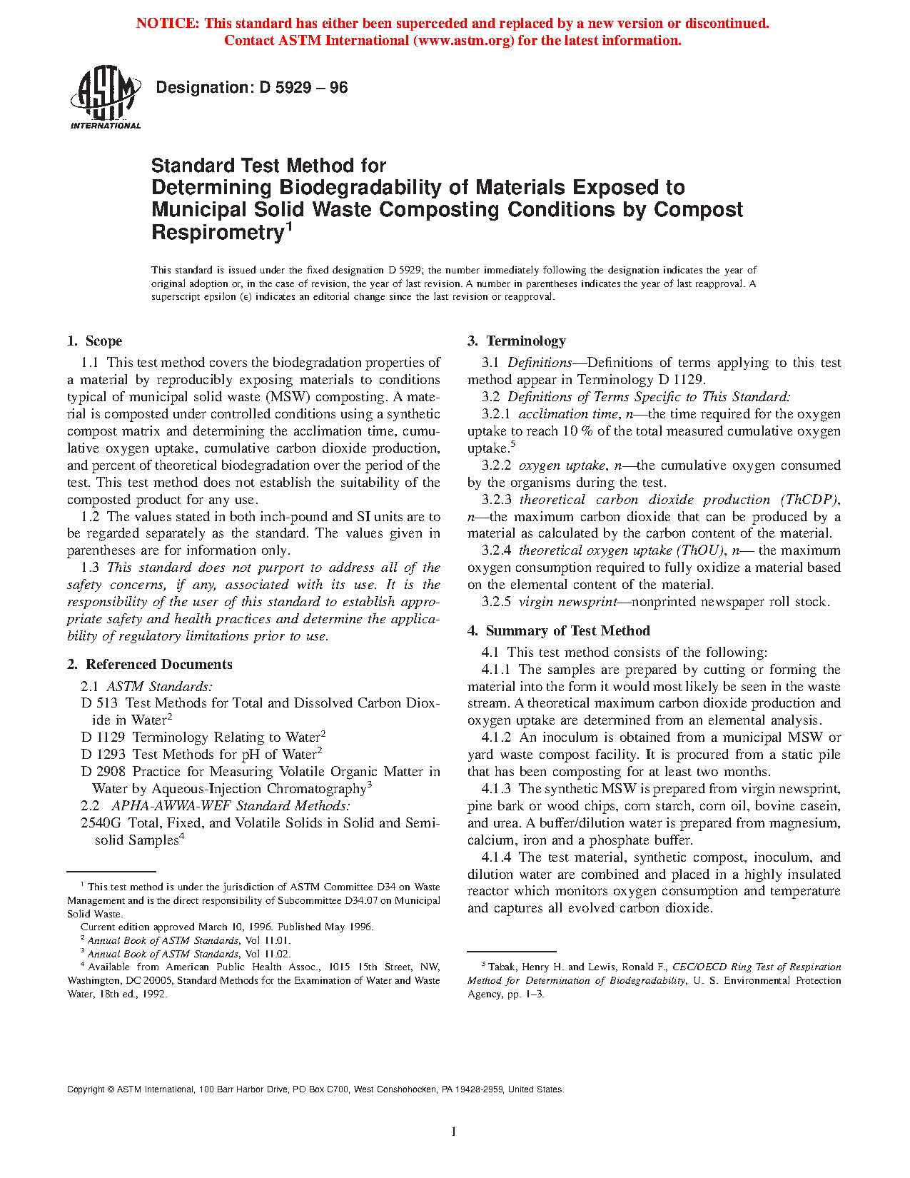 1.1 This test method covers the biodegradation properties of a material by reproducibly exposing materials to conditions typical of source-separated organic municipal solid waste (MSW) composting. A material is composted under controlled conditions using a synthetic compost matrix and determining the acclimation time, cumulative oxygen uptake, cumulative carbon dioxide production, and percent of theoretical biodegradation over the period of the test. This test method does not establish the suitability of the composted product for any use.