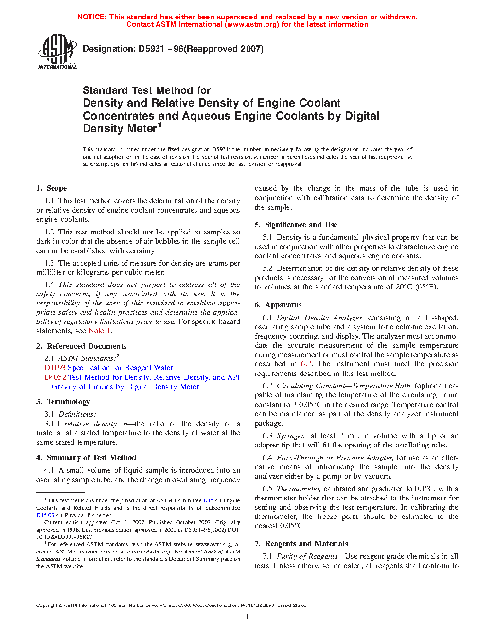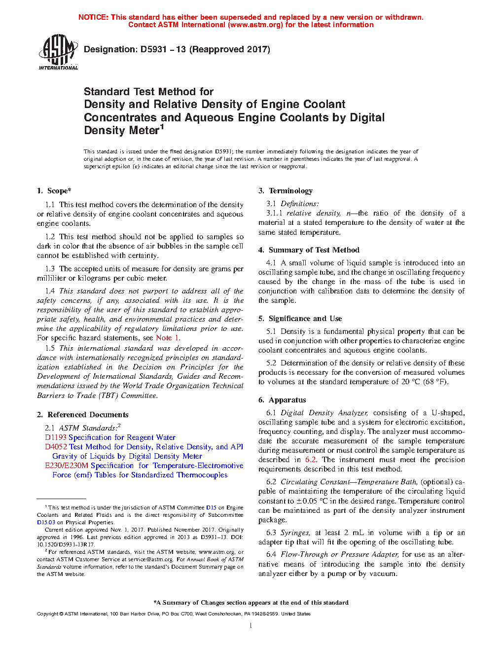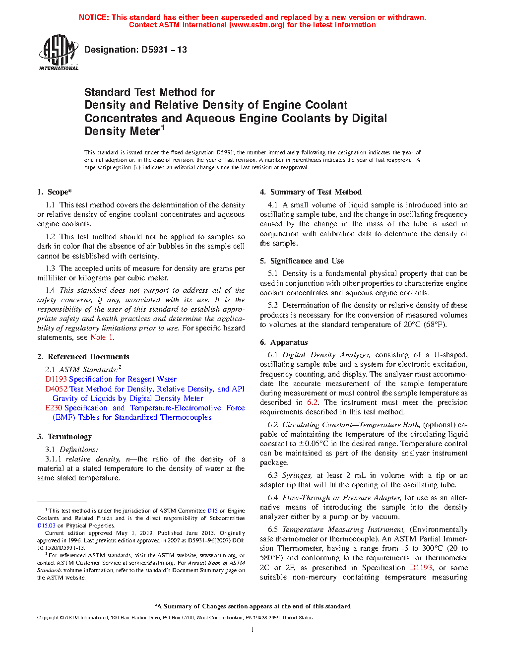 1.1 This test method covers the determination of the density or relative density of glycols, glycerin, heat transfer fluids, engine coolant concentrates, and aqueous engine coolants.
