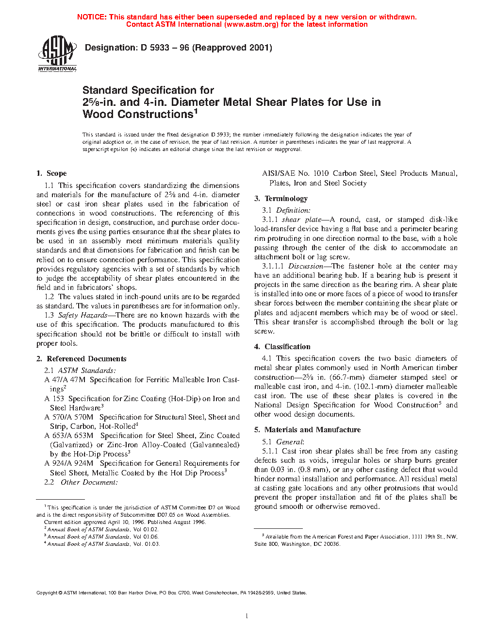 1.1 This specification covers standardizing the dimensions and materials for the manufacture of 25/8 and 4-in. diameter steel or cast iron shear plates used in the fabrication of connections in wood constructions. The referencing of this specification in design, construction, and purchase order documents gives the using parties assurance that the shear plates to be used in an assembly meet minimum materials quality standards and that dimensions for fabrication and finish can be relied on to ensure connection performance. This specification provides regulatory agencies with a set of standards by which to judge the acceptability of shear plates encountered in the field and in fabricators' shops.