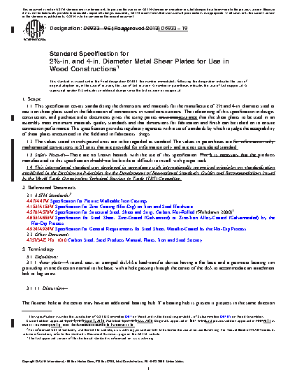 1.1 This specification covers standardizing the dimensions and materials for the manufacture of 2 5/8 and 4-in. diameter steel or cast iron shear plates used in the fabrication of connections in wood constructions. The referencing of this specification in design, construction, and purchase order documents gives the using parties ensurance that the shear plates to be used in an assembly meet minimum materials quality standards and that dimensions for fabrication and finish can be relied on to ensure connection performance. This specification provides regulatory agencies with a set of standards by which to judge the acceptability of shear plates encountered in the field and in fabricators' shops.