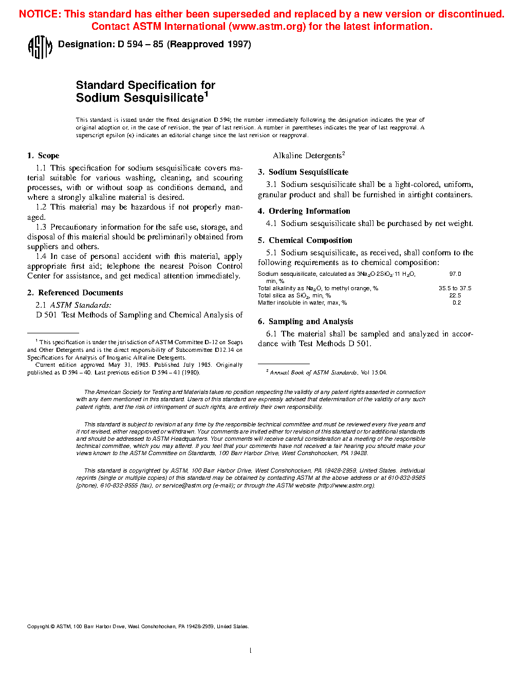 Standard Specification for Sodium Sesquisilicate (Withdrawn 2001)