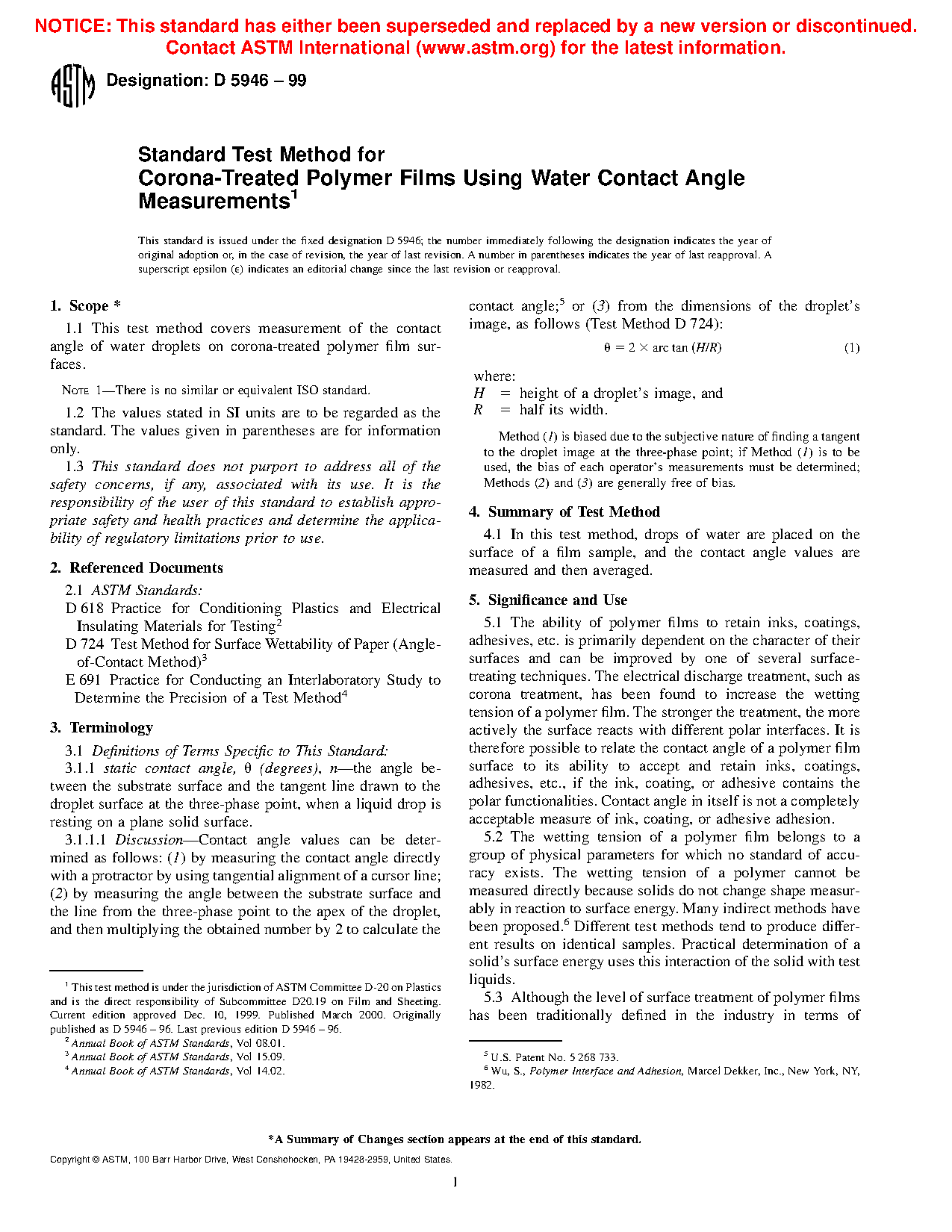 5.5 Almost all materials have variations in contact angle as one moves from point to point. Nonuniform treatment of film with corona treaters may also add variability to the results. Therefore, multiple measurements are necessary to reflect variation in treatment and surface roughness.