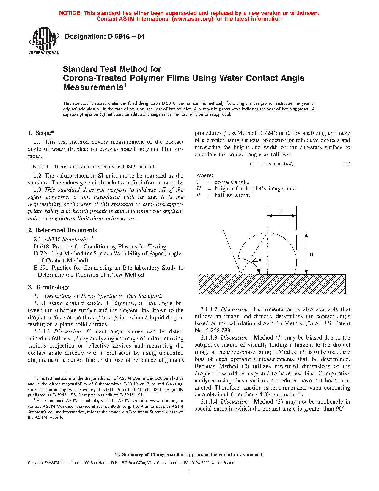 1.1 This test method covers measurement of the contact angle of water droplets on corona-treated polymer film surfaces.