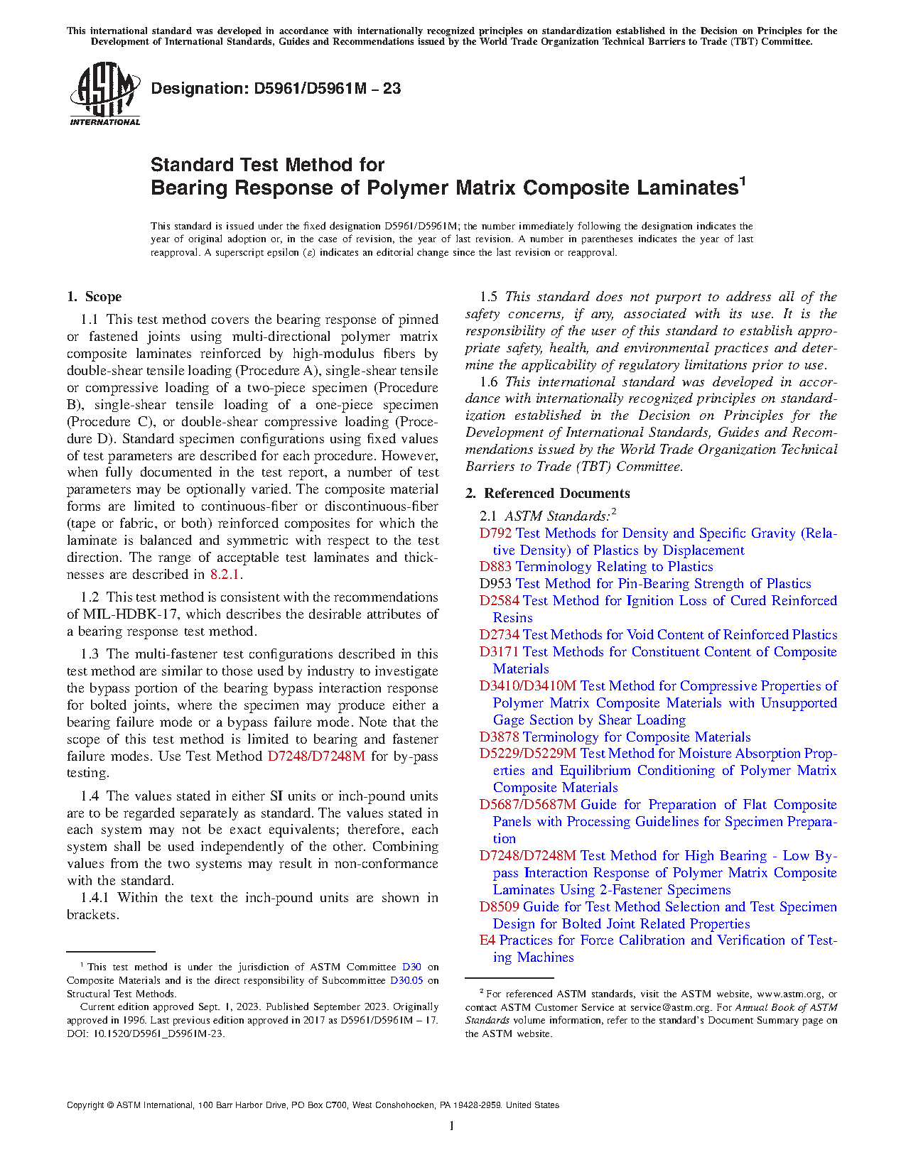 1.2 This test method is consistent with the recommendations of MIL-HDBK-17, which describes the desirable attributes of a bearing response test method.