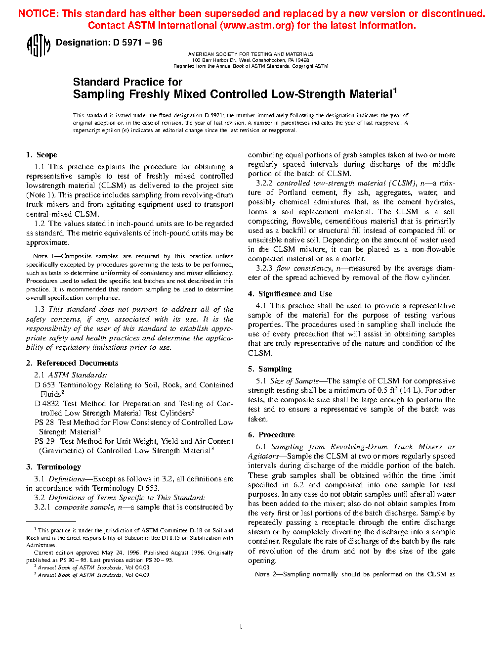 1.1 This practice explains the procedure for obtaining a representative sample of freshly mixed controlled low-strength material (CLSM) as delivered to the project site on which tests are to be performed to determine compliance with quality requirements of the specifications under which the CLSM is furnished (Note 1). This practice includes sampling from revolving-drum truck mixers and from agitating equipment used to transport central-mixed CLSM. This Practice is based on Practice C 172 for concrete.