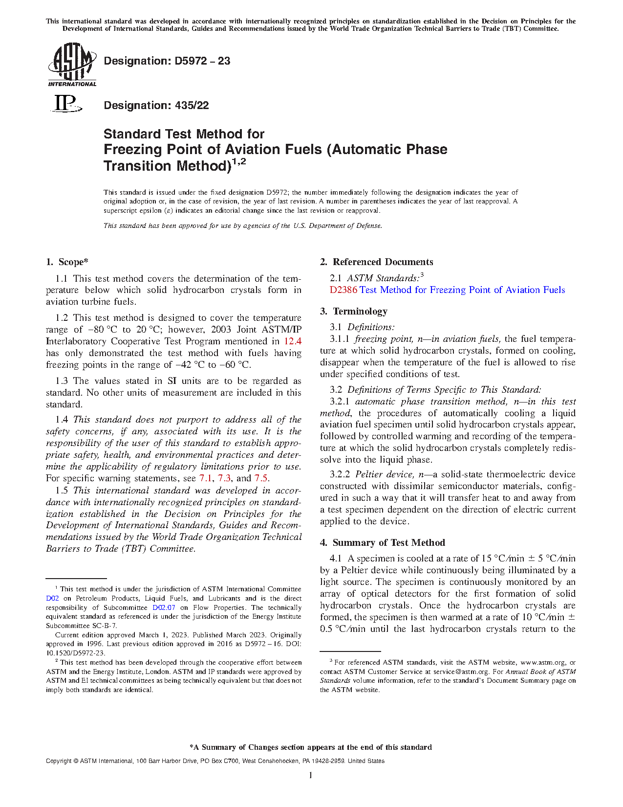 1.1 This test method covers the determination of the temperature below which solid hydrocarbon crystals form in aviation turbine fuels.