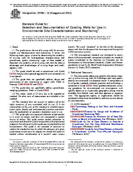 1.1 This guide covers the use of existing wells for environmental site characterization and monitoring. It covers the following major topics: criteria for determining the suitability of existing wells for hydrogeologic characterization and groundwater quality monitoring, types of data required to document the suitability of an existing well, and the relative advantages and disadvantages of existing large- and small-capacity wells.